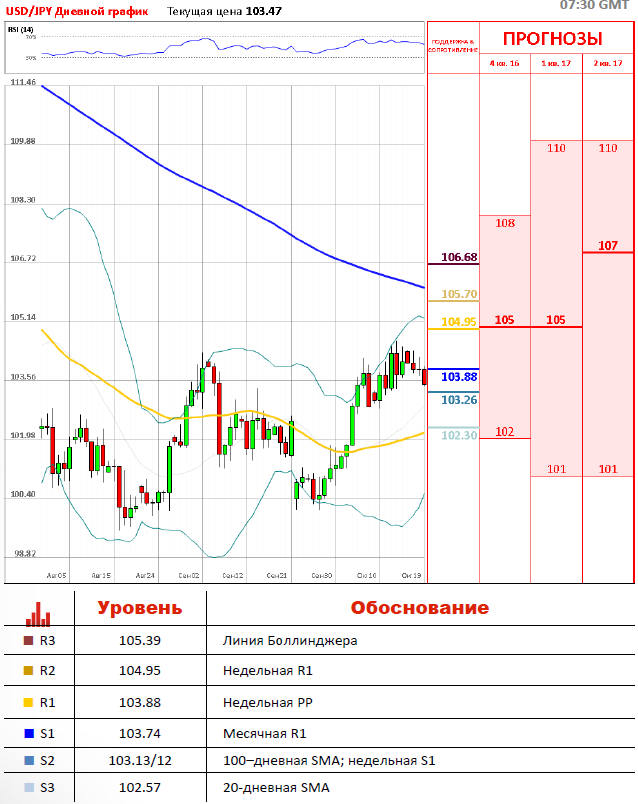 Во вторник, американская валюта значительно ослабла после публикации экономических отчетов, которые снижают вероятность повышения ставок. Продолжительный бычий тренд остаётся, однако, инструмент провалился под границу восходящего канала, в область 103.88. На данный момент, пара снизилась ещё больше, пробив месячную R1 на уровне 103.74, устремившись к отметке 103.56. Наиболее вероятным сценарием для пары будет снижение вплоть до 103.30, после чего, может произойти разворот. Тем не менее, при другом развитии событий, пара может спуститься вплоть до недельной S1 на уровне 103.12.