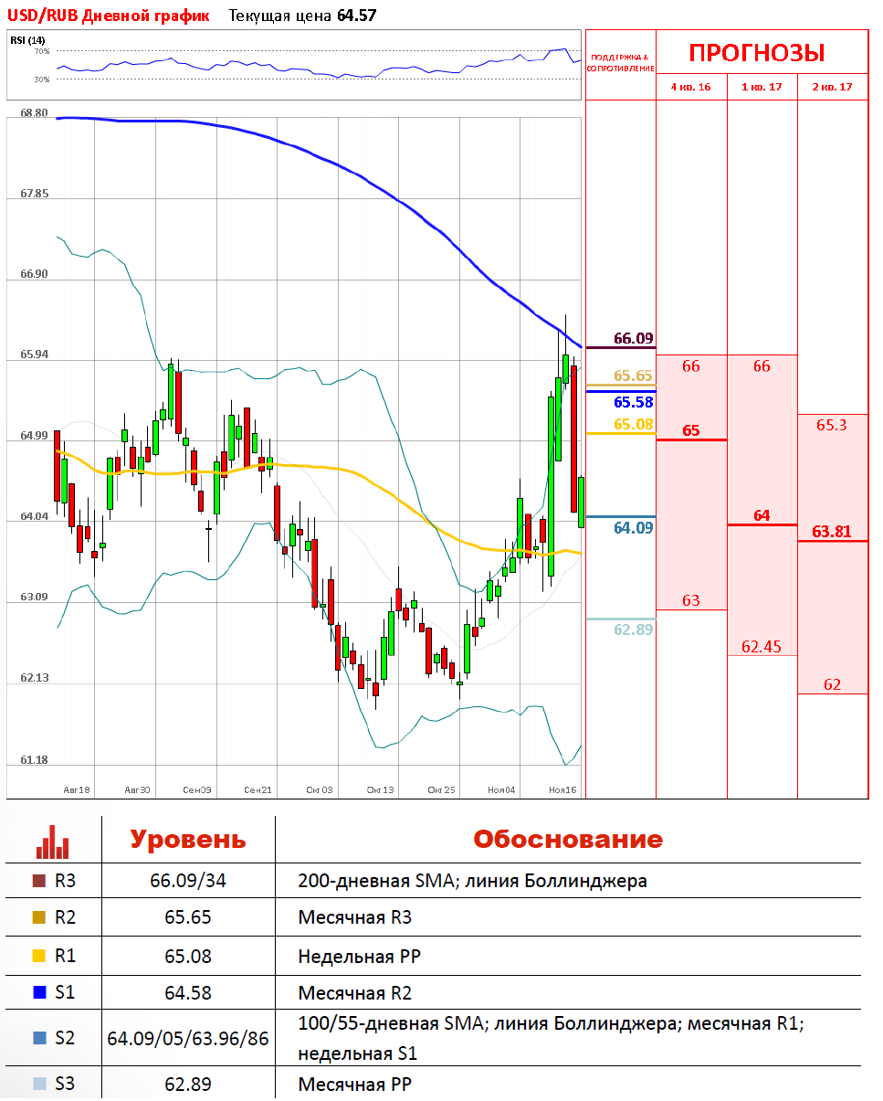В течение вчерашних торгов пара снизилась почти на 3% так как нефтяные котировки демонстрировали существенное укрепление. Рост цены на нефть был обусловлен ожиданиями трейдеров, что страны ОПЕК заключат договор по ограничению добычи «черного золота». Пара пробила недельную R3 на уровне 65.08, а также месячную R2, вплотную приблизившись к 100-дневной SMA. На данный момент инструмент остановил свое падение и скорректировался вверх, снова подойдя к отметке 64.58. Вероятно пара продолжит находится в области 65.