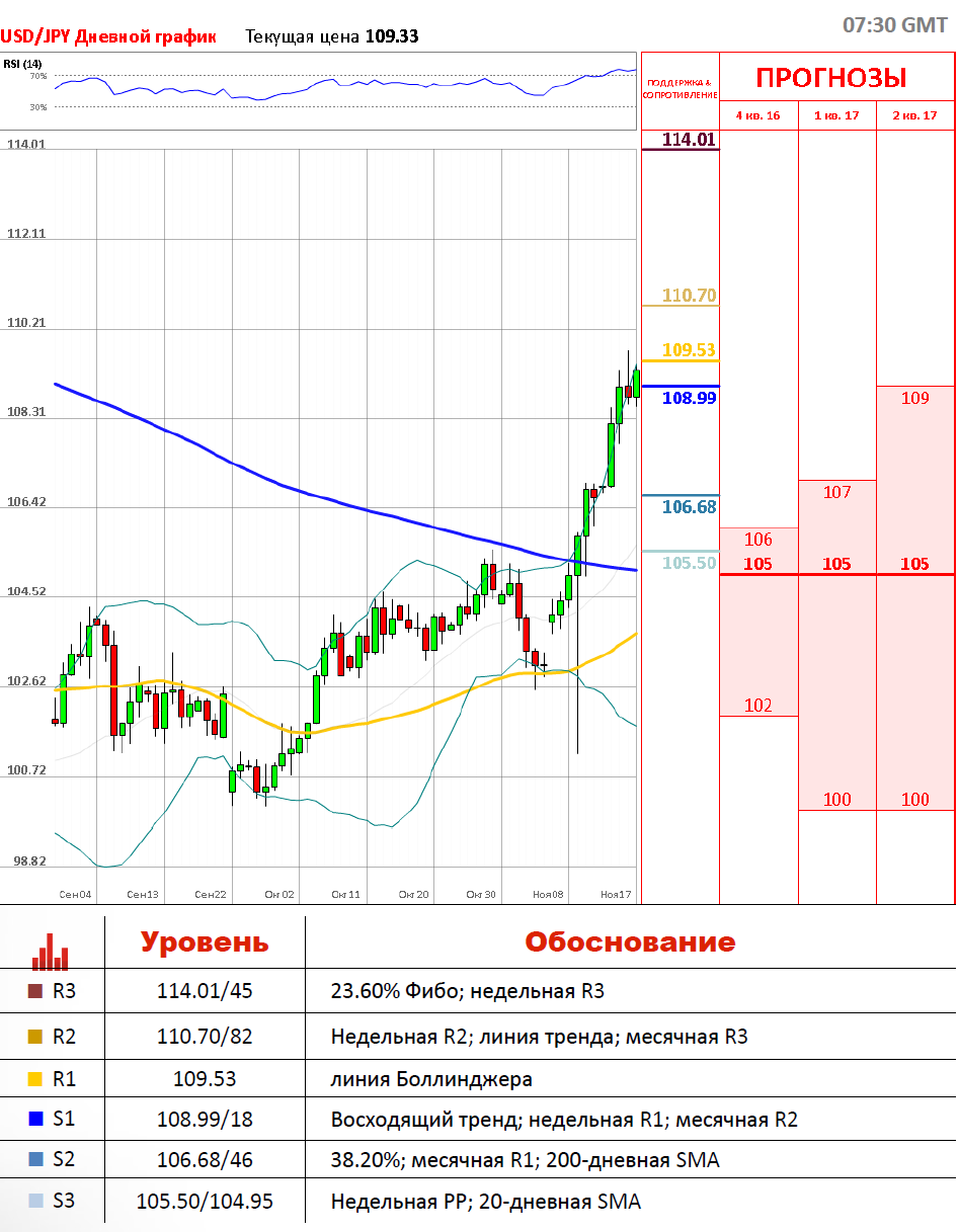 В соответствии с прогнозами, данная валютная пара демонстрировала рост в эту среду, так как инвесторы предпочти рисковые валюты, в то время как Nikkei 225 вырос до максимумов февраля. Более того, дополнительную поддержку доллар получает от ожиданий поднятия процентной ставки в декабре. Пара торгуется в резком восходящем канале, оставаясь в области 109. Вероятно, цена направится в район ближайшего сопротивления 110.00. Если эта отметка будет достигнута, то рост пары, вероятно, продолжится в область недельной R2. Пробой уровня 110.7 вверх усилит восходящий импульс.