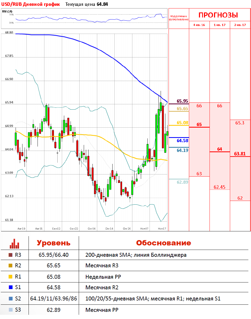 Вчерашние торги, закрылись смешанно. Валютная пара USD/RUB выросла на 0,26%, до 64.83 рублей. Направление курсу рубля задавали динамика по нефти, облигациям и основным валютным парам на валютном рынке форекс. Таким образом, доллар перешёл в наступление по всему рынку после выхода сильных экономических данных в США и выступления Джанет Йеллен в Конгрессе, заявления которой укрепили ожидания повышения процентной ставки ФРС на заседании FOMC в декабре. Сейчас пара продолжает расти, где торгуется выше недельной РР около 65.15.
