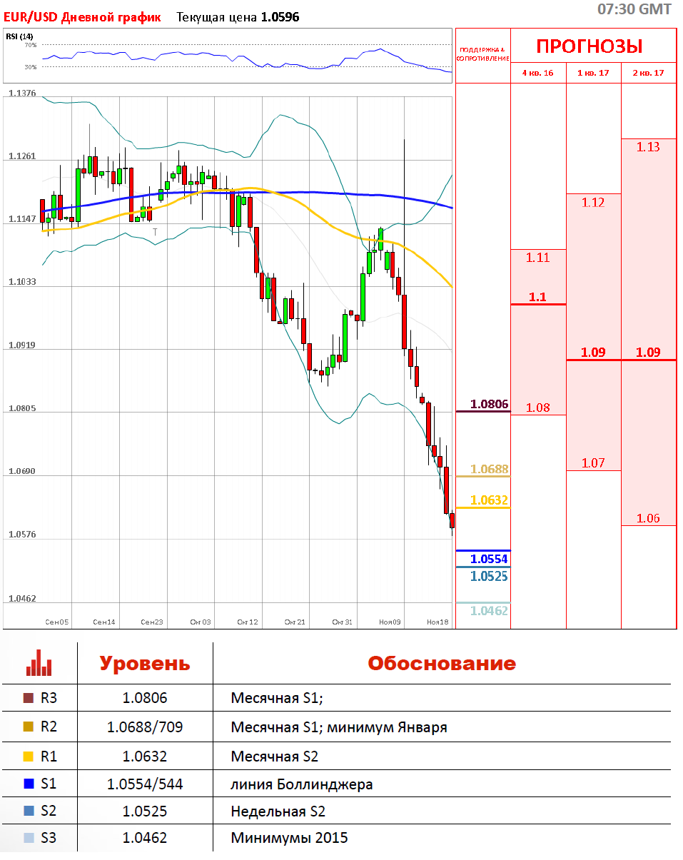 Евровалюта попыталась удержать позиции после выпуска индекса потребительских цен за октябрь, которые совпали с прогнозом. Более того, доллар несколько ослаб, однако поддержку получает на оптимизме возможного повышения процентной ставки в декабре. Вчера торги проходили в негативном настроении, тогда как пара пробила недельную S1 на отметке 1.068, а также месячную S2 на уровне 1.063. Неспособность закрепиться в области 1.0700 ведет к риску снижения в район 1.0650. Дальнейшее укрепление невозможно, пока не будет пробит уровень 1.070.