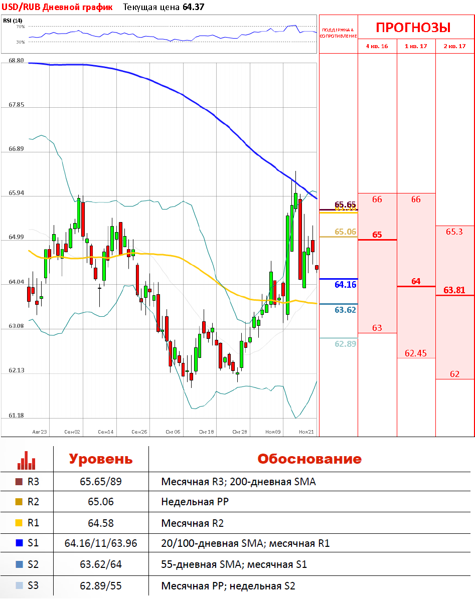 Рубль на минувшей неделе показал неоднозначную динамику, но при этом всё же смог по ее итогам укрепиться к доллару. Отчасти это было обусловлено восстановлением цен на нефть марки Brent. Cейчас рост нефтяных котировок сдерживает ралли доллара, которое началось после выборов в США, и сегодня мы можем наблюдать укрепление рубля против доллара США, где пара торгуется около отметки 64.24. Снизу пара сдерживается сильным скопление поддержек, а именно 20/100-дневной SMA и месячной R1 на отметках 64.16/11 и 63.96.