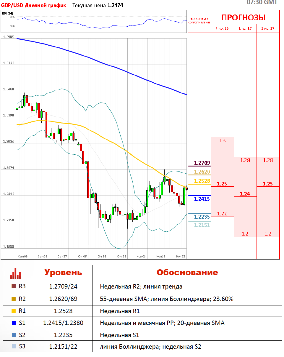 В понедельник пара торговалась в восходящей коррекции, не смотря на крепость американской валюты, а также оптимизма, касательно ускорения экономического развития во время правления нового президента. Нельзя не отметить, что давление на фунт после Брекзита всё ещё не рассеялось. Тем не менее, вчера паре удалось пронзить месячную PP на отметке 1.238, а также недельную PP на уровне 1.2415. Уверенный рост выше текущего сопротивления может открыть путь для дальнейшего роста пары в область 1.2528, где находится недельная R1.