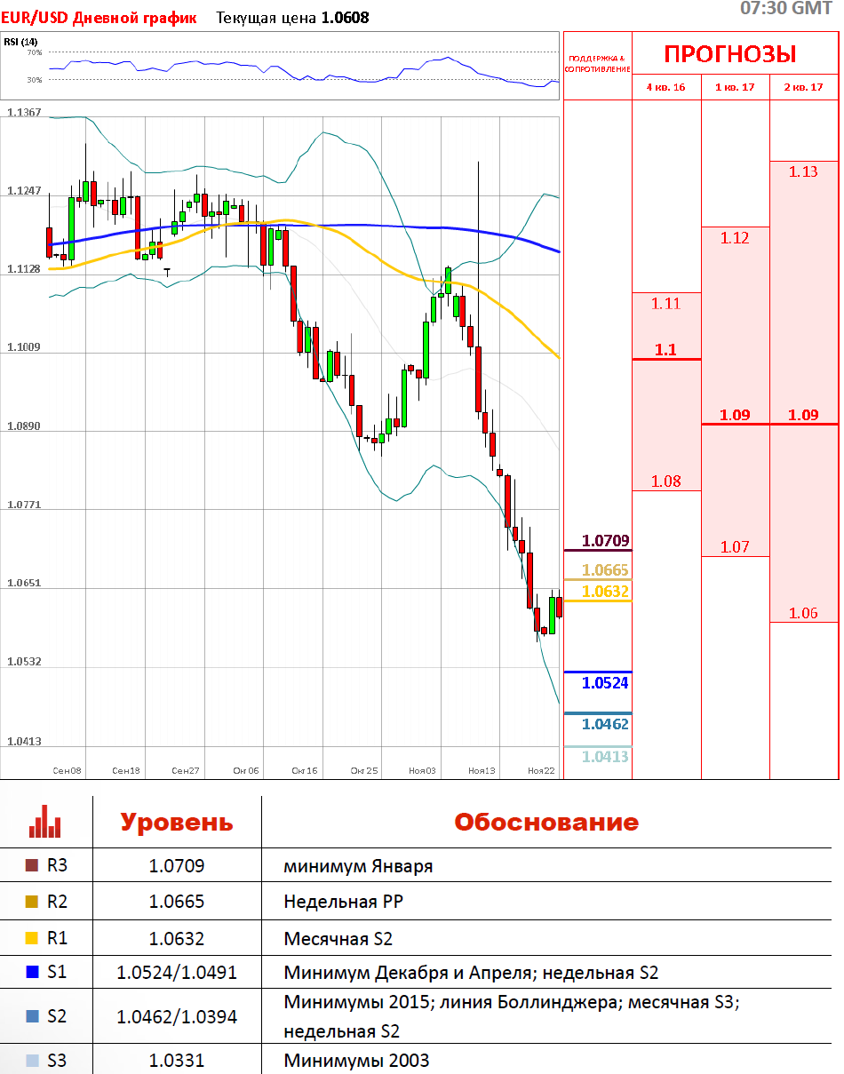 Очередная попытка продавцов европейской валюты продавить месячные минимумы на торгах во вторник, 22 ноября, не увенчалась успехом, а положительные данные по рынку труда в США оказали лишь временную поддержку американскому доллару. Завершились торги в пользу доллара, который укрепился против евро на 2 пункта, волатильность торгов составила 74 пункта. Сейчас валютная пара продолжает торговаться с негативной динамикой, где сверху уровнем сопротивления для нее выступает недельная S2, которая расположилась на отметке 1.0632.