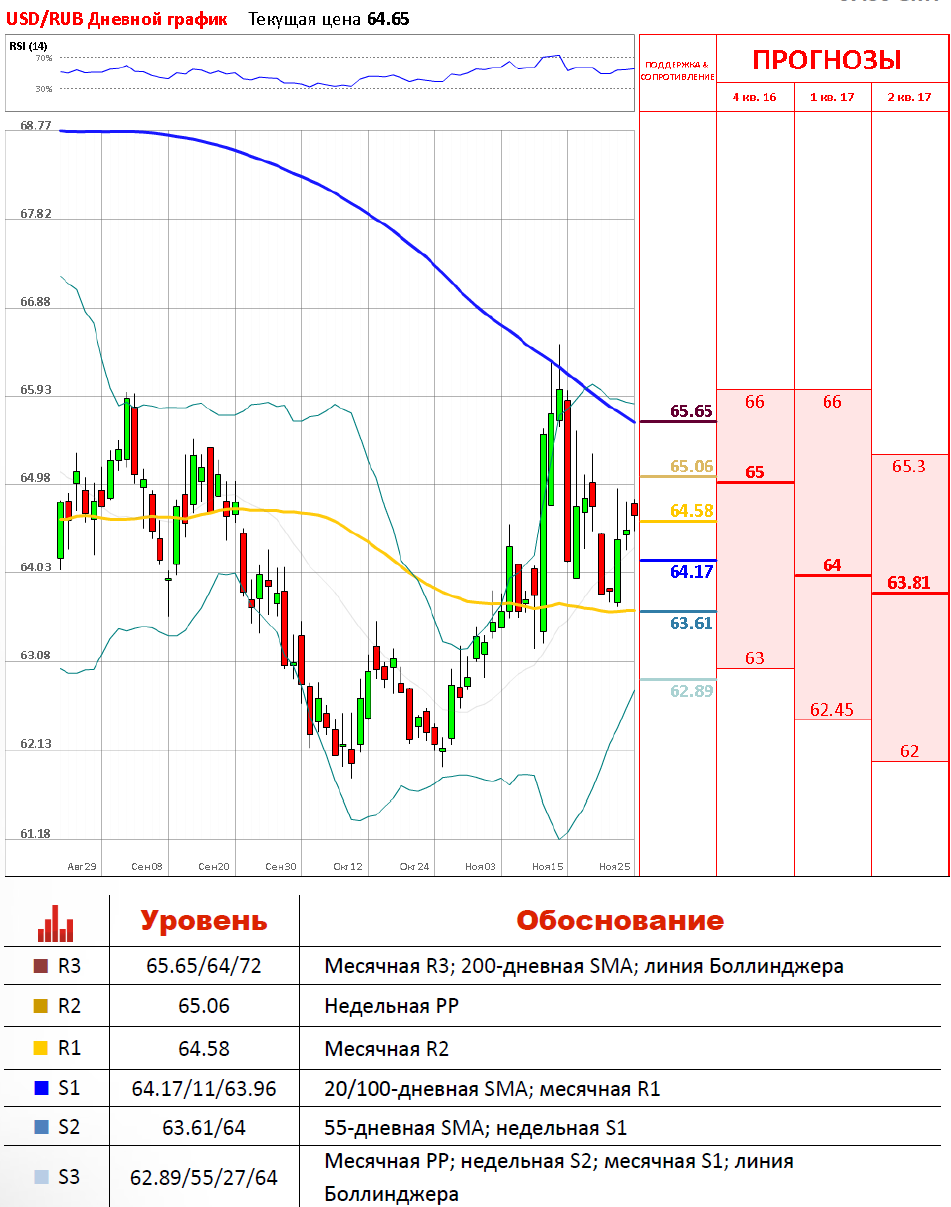Российская валюта вчера, 24 ноября, не демонстрировала резких движений и завершила сессию без значимых изменений, но в зеленой зоне. Низкая торговая активность вкупе с отсутствием сигналов с рынка нефти обусловили консолидацию пары USD/RUB в 52-пунктовом диапазоне. Тем не менее, сегодня валютная пара прервала свое восходящее движение, и сейчас пара USD/RUB торгуется в красной зоне, где уже успела пересечь месячную R2, которая расположилась на отметке 64.58. Сейчас пар находится около уровня 64.32, где снизу сдерживается 20 и 100-дневными SMA на 64.17/11.