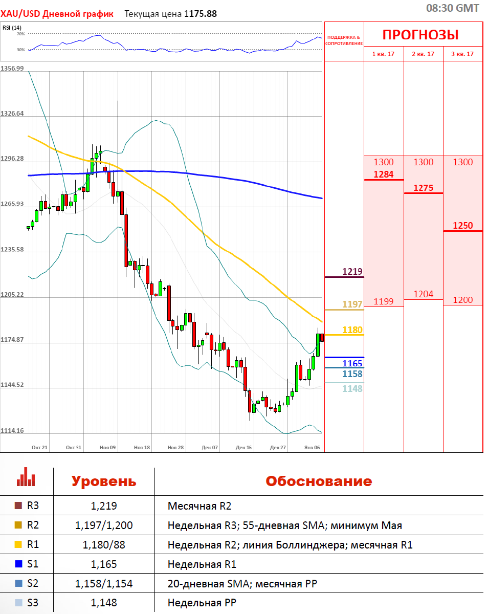 Цена на золотой металл снизилась сегодня в пятницу, 6 января, после значительно сильного роста в течение всей недели. Котировки фьючерсов на золото росли, завершив торги на 5-недельном максимуме, так как доллар снижался после протоколов декабрьского заседания ФРС. Однако, сейчас пара XAU/USD торгуется в красной зоне, где сверху поддерживается недельной R2 на 1,179, выше которой пара так и не сумела закрепиться, хотя и усиленно тестировала. Снизу пара сдерживается уровнем 1,169 и недельной R1, которая расположилась на отметке 1,165.