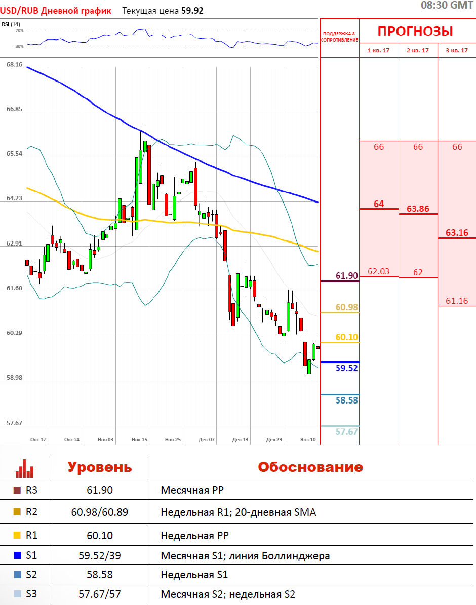 Курс доллара США в начале сегодняшних торгов прибавил в цене против российской валюты. Тем не менее, сейчас пара развернулась, где торгуется в красной зоне. Многие полагают, что до тех пор пока нефть торгуется выше уровня $54,30 за баррель, российской валюте ничего не угрожает, и что более того вчерашнее ослабление рубля является технической коррекцией. Рублевая стоимость бочки Brent находится на комфортном уровне для правительства РФ и составляет 3309 рублей. Идеальным вариантом для сегодняшней динамики дня станет рост цены Brent до $56,09, и снижение курса доллара до 59,46 к месячной S1.
