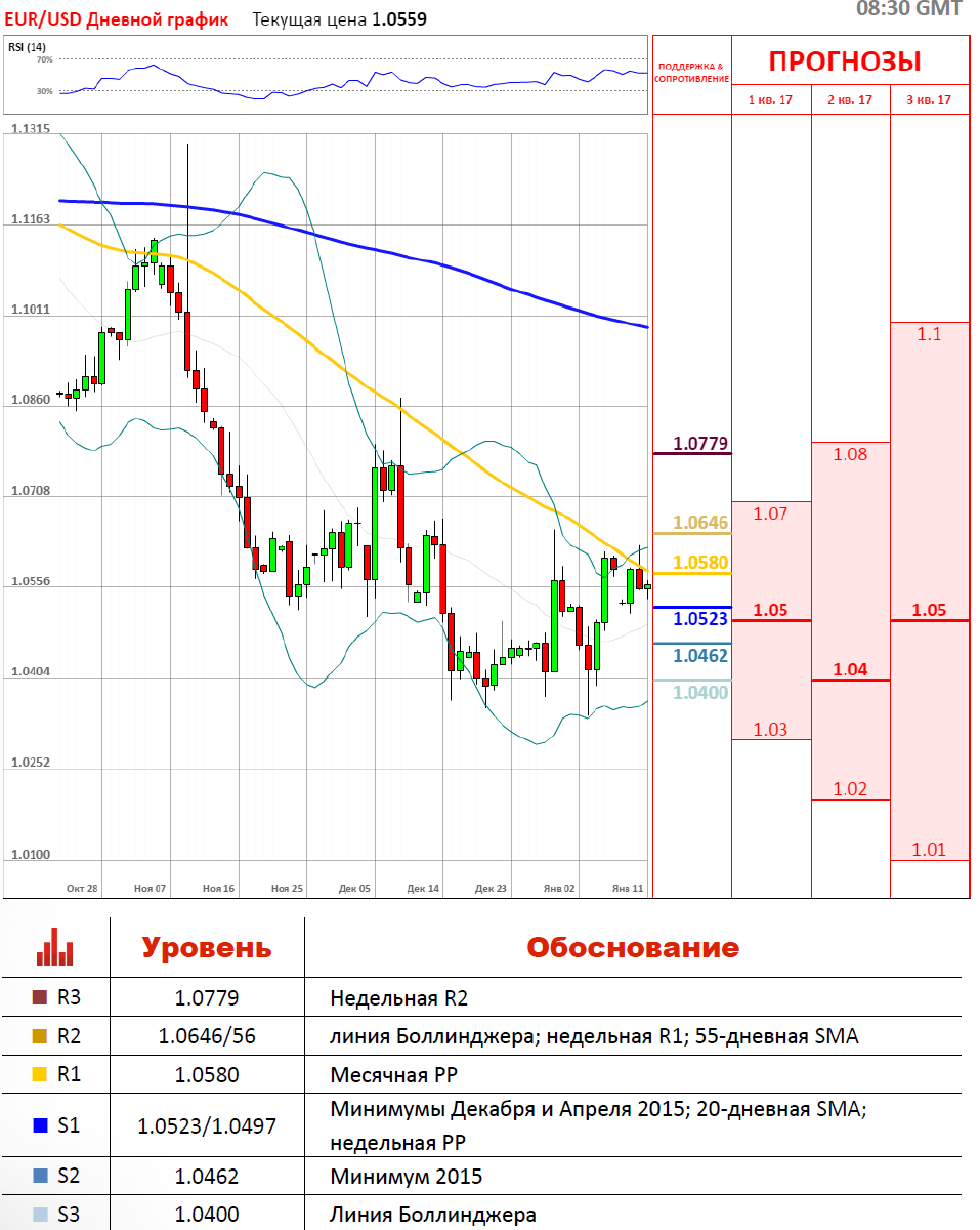 Доллар США сумел вернуть себе ряд позиций против европейской валюты на торгах во вторник, 10 января, после неудачной попытки роста евро в первой половине дня. Поддержку оказала хорошая макроэкономическая статистика по американской экономике. Завершились торги в пользу доллара США, который укрепился против евро на 20 пунктов, а волатильность торгов составила 76 пунктов. Сегодня торги проходят со слабой динамикой и преимущественно в разнонаправленном движении около уровня 1.0557, в преддверии пресс-конференции Трампа.