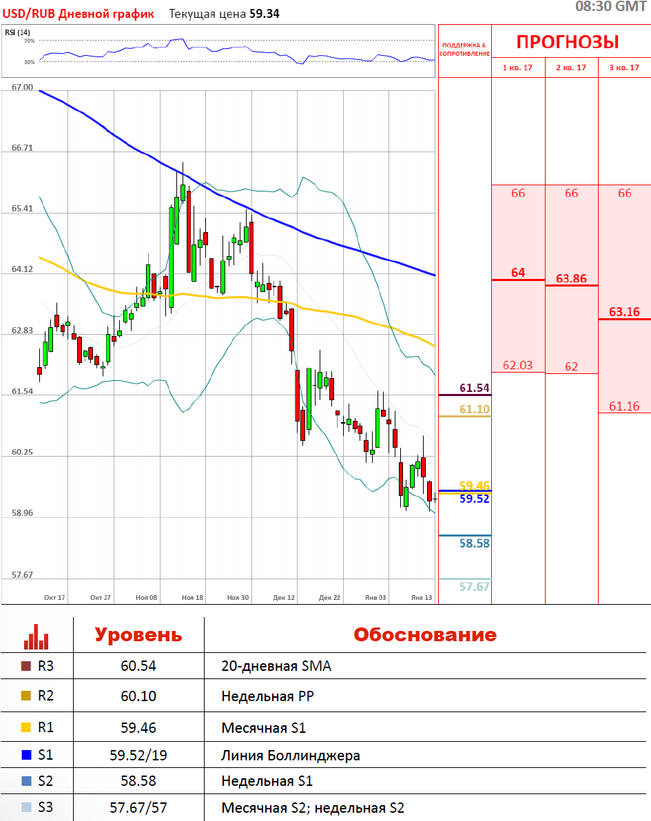 «Сегодня по паре доллар/рубль возможен тест уровня 59 руб. с последующим снижением к 58,90 руб. Во второй половине дня перед закрытием торговой недели курс доллара, скорее всего, восстановится до 59,15/33 руб. В конце недели вряд ли получится закрепиться ниже 59 рублей».