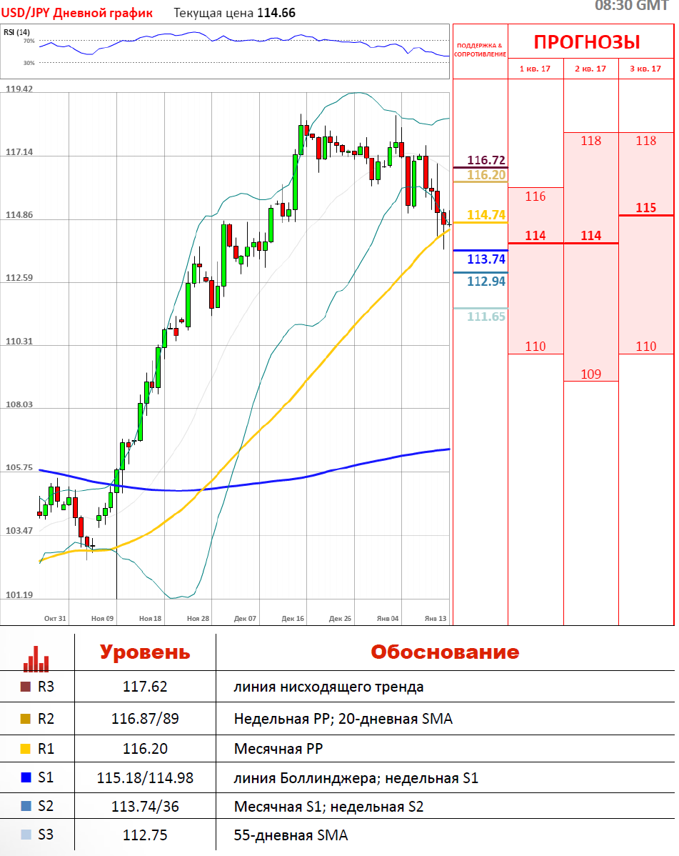 На протяжении всей недели мы наблюдали снижение по паре USD/JPY. Сегодня в центре внимания данные по розничным продажам и индексу цен производителей в США и если данные не разочаруют, пара USDJPY сможет завершить неделю выше 116,00. Однако, пока что пара торгуется разнонаправленно и сейчас находится в красной зоне, где сверху сдерживается недельной S1, которая расположилась на уровне 115.18 и линией Боллинджера на 114,73. Снизу же валютную пара поддерживает месячная S1 и недельная S2, которые находятся на отметках 113.74/36.