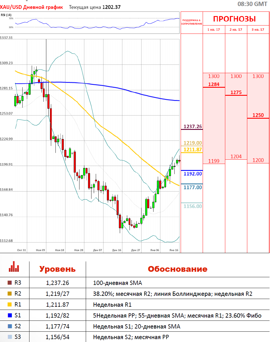 Цены на золото начали неделю с повышения до наивысшего уровня за два последних месяца на ожиданиях инвесторов выступления британского премьер-министра Терезы Мэй и инаугурации избранного президента США Дональда Трампа. Таким образом, сейчас золотой металл торгуется между линиями поддержки и сопротивления, а именно между недельной РР на 1,191 и недельной R1 на 1,211. Так же золото получило хорошую поддержку на неопределенности о темпах повышения ФРС процентной ставки в этом году.