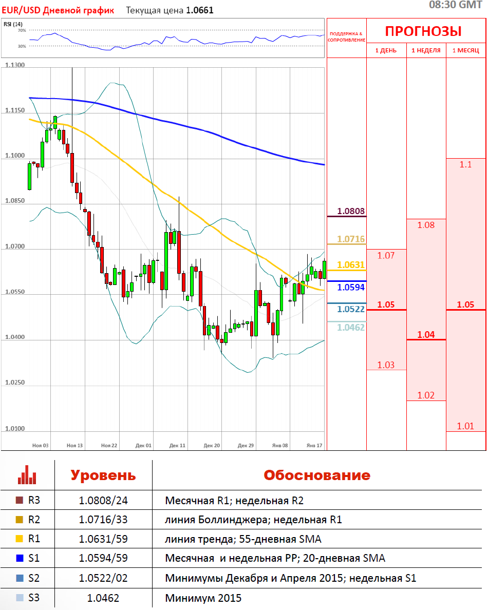 «В понедельник курс евро/доллар закрылся снижением. После падения до 1,0579 пара перешла в коррекционную фазу. На американской сессии активность участников рынка и объём торгов были низкими из-за празднования в США Дня Мартина Лютера Кинга».