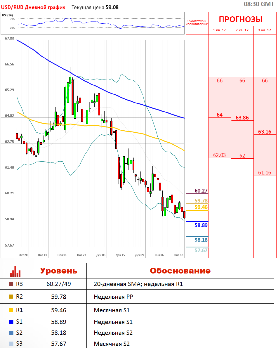 Рубль вчера, 17 января, рос, где котировки пары USD/RUB обновили минимумы с июля 2015 года, снизившись к отметке 58.93. Но удержаться на достигнутом не смогли и снова вернулись выше уровня 59.00. Поддерживают рубль сразу несколько факторов. Это и рост цен на нефть, и начало налогового периода в России. Также рубль пользуется слабостью доллара, который продолжает коррекцию. Тем не менее пока нет достаточно оснований для того, чтобы пара надолго зафиксировалась ниже уровня 59.00.