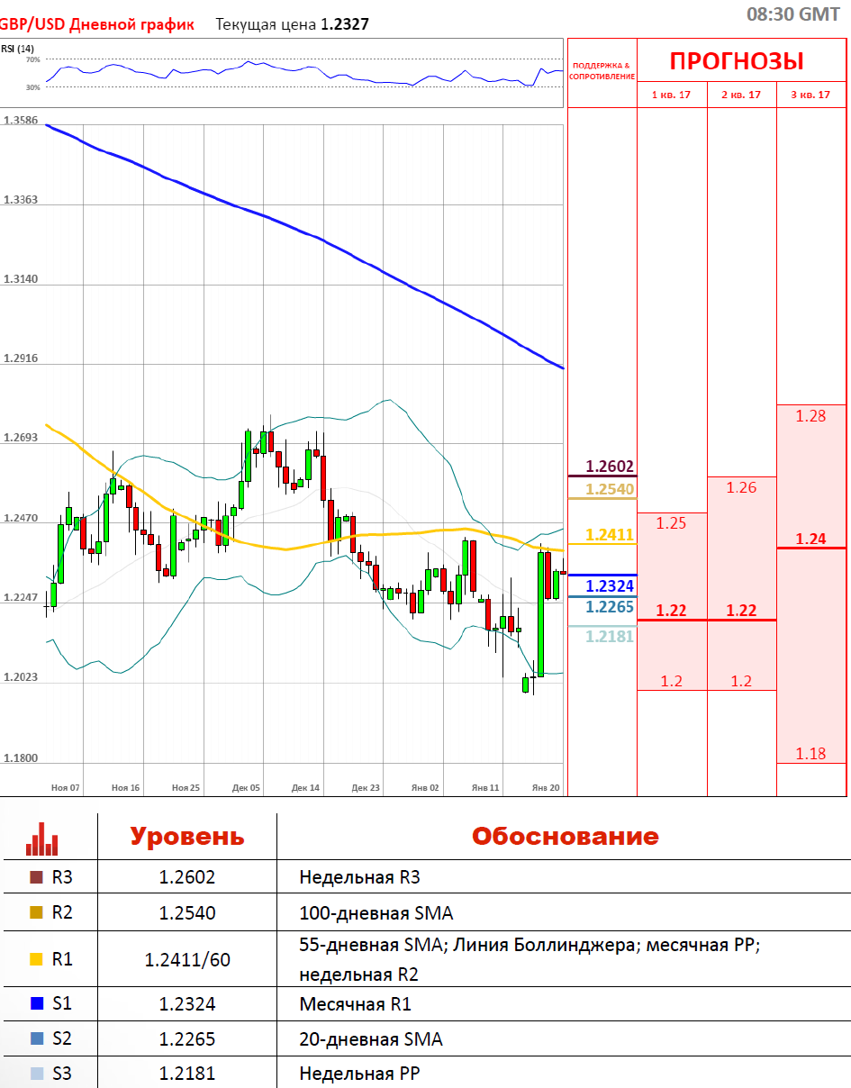 Валютная пара GBP/USD завершила торги в четверг с неплохим результатом, корректируясь после резкого падения в среду. Фунт получил некоторую поддержку от снижения пары EUR/GBP после пресс-конференции Драги. Доллар США закончил четверг на слабой ноте. По мере снижения цен на акции на Уолл-стрит, доллар снижался, толкая пару GBP/USD вверх. Сегодня валютная пара так же продолжает демонстрировать слабый рост, где снизу поддерживается недельной R1, которая расположилась на отметке 1.2324.