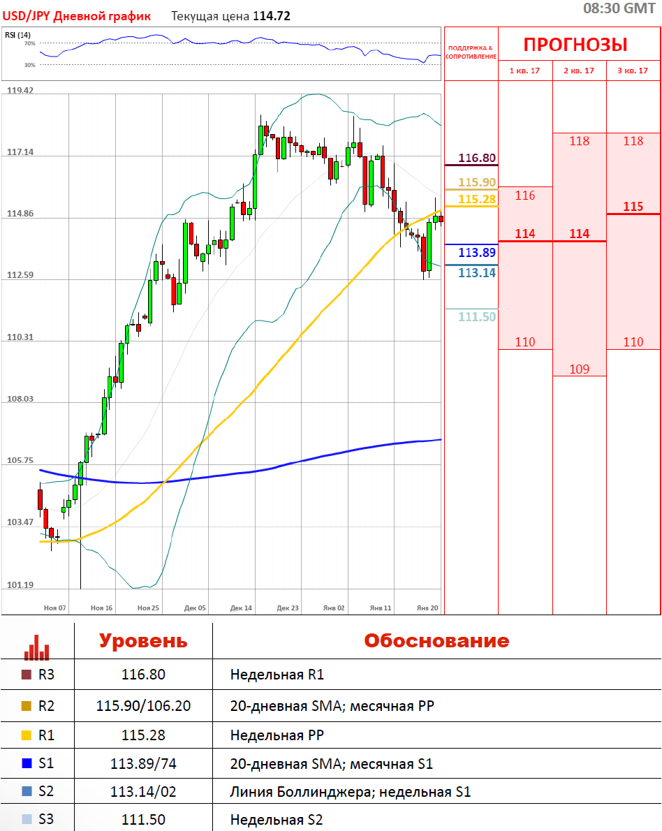 Валютная пара USD/JPY завершила торги в четверг c небольшим укреплением, поддерживая рост днем ранее. Пара получила некоторую поддержку после пресс-конференции Драги. Даже не смотря на то, что доллар США в четверг был достаточно слаб, пара все таки сумела завершить торги в зеленой зоне. Сегодня торги ведутся в разнонаправленном движении, и пара пытается консодилироваться. Сверу она сдерживается недельной РР, которая расположилась на отметке 115.28.