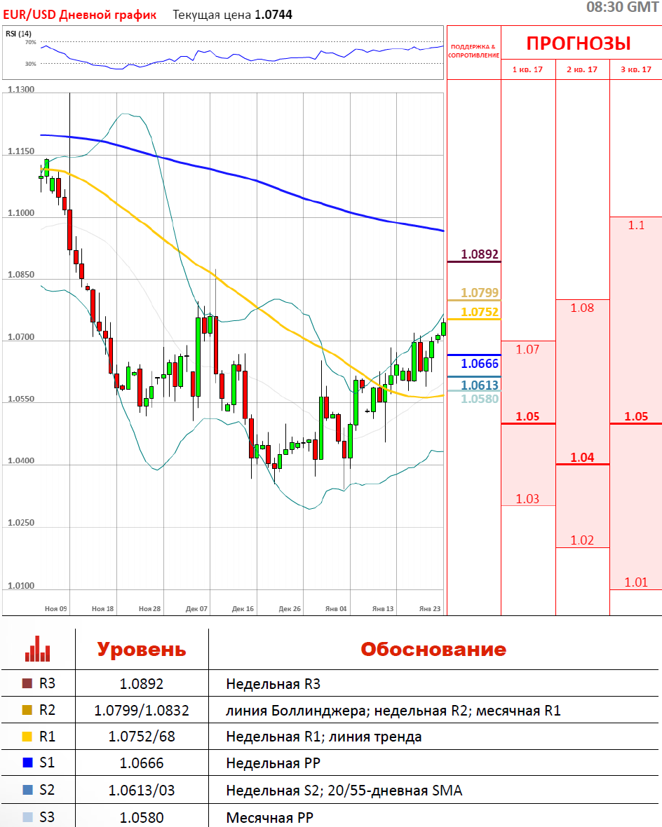 Многие инвесторы рассчитывали на укрепление доллара США после инаугурации президента США Дональда Трампа, однако отсутствие ясности касательно реформы налогообложения и налогово-бюджетного стимулирования, в речи нового президента, оказало давление на американский доллар во второй половине дня на торгах в пятницу, 20 января. Завершились торги в пользу евро, который укрепился против доллара США на 37 пунктов, волатильность торгов составила 85 пунктов. Пара продолжает расти, где тестирует недельную R1 на 1.0752.