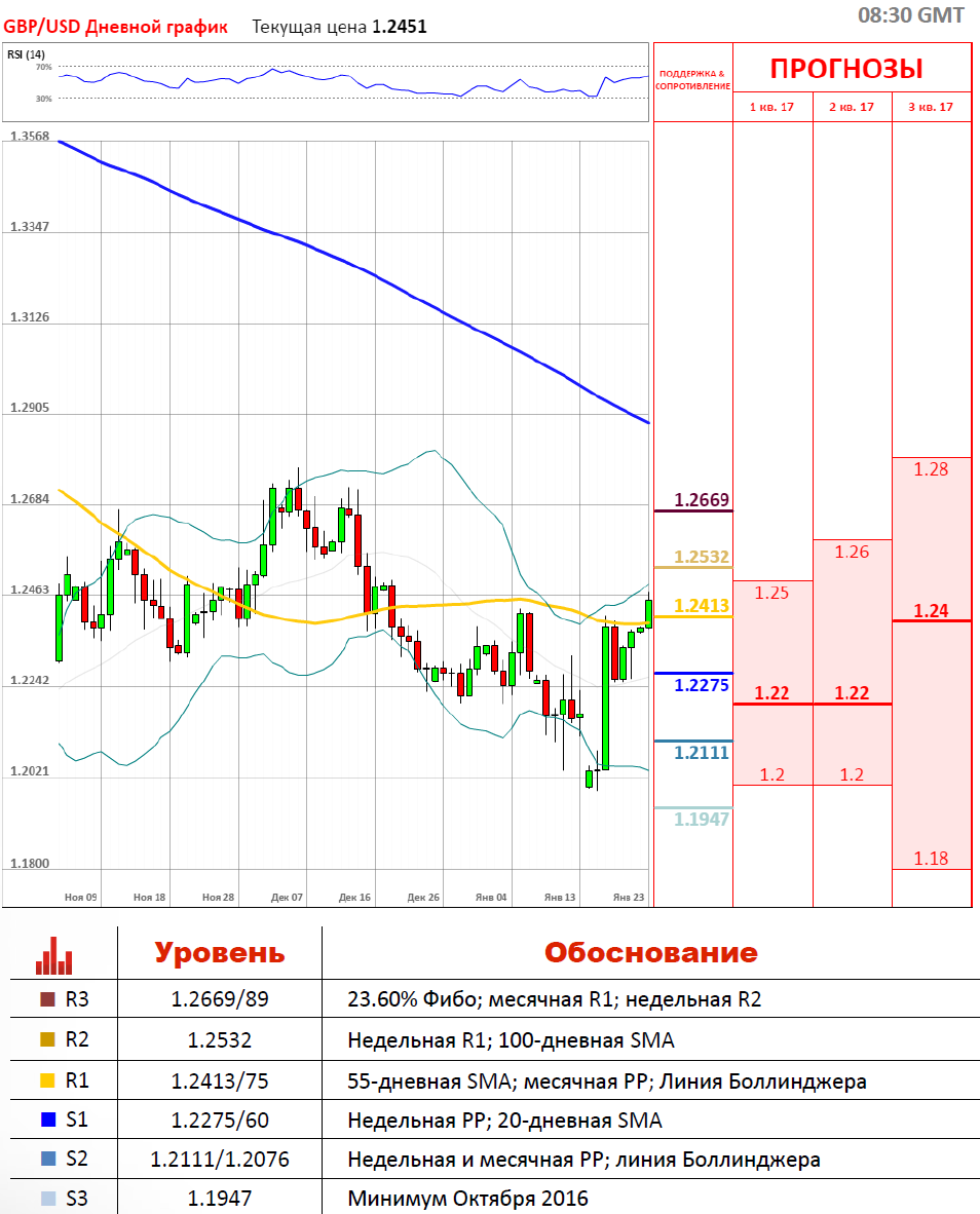 На прошлой неделе во вторник курс фунта продемонстрировал значительный рост, поскольку премьер-министр Великобритании Тереза Мэй, вопреки ожиданиям, обещала плавный и упорядоченный процесс выхода страны из Евросоюза. Парламент будет иметь право голосовать по любому соглашению с ЕС, поэтому рассмотрение на уровне законодателей повышает степень доверия со стороны инвесторов. Уже сегодня в ходе торгов курс фунта к доллару США превысил максимумы 5 и 6 января и обновил годовые экстремумы, вплотную приблизившись к отметке 1.2500, где сумела пересечь месячную РР на 1.2443.