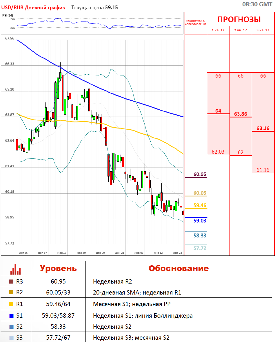 Российская валюта во вторник немного подрастает вслед за нефтью. Можно сказать, что пара USD/RUB находится под давлением сразу нескольких факторов, а именно слабого доллара и сильного рубля. В слабости американской валюты виновна инаугурация Трампа и предстоящий период неопределенности в плане экономической политики. В силе рубля виновно некоторое укрепление цен на нефть, а также общий более позитивный рыночный настрой. Некоторые что с приходом Трампа отношения между Россией и США могут потеплеть.