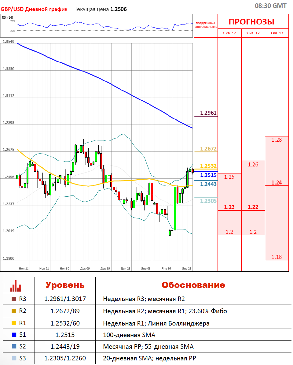 Вчерашние торги по валютной паре GBP/USD завершились снижением, где фунт потерял 18 пунктов против доллара США, тогда как волатильность же торгов составила 129 пунктов. Сегодня валютная пара торгуется с позитивной динамикой, где пара сумела вырасти на 56 пунктов и достигнуть отметки 1.2597, которая была пробита еще в середине декабря. Сегодня валютная пара сумела пересечь недельную R1, которая расположилась на уровне 1.2532. Сверху же валютная пара сдерживается сильным скоплением сопротивлений, а именно недельной R2 и месячной R1 на 1.2689/86.