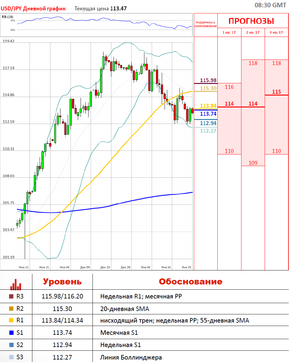Вчера валютная пара USD/JPY завершила торги ростом, где амриканский доллар вырос против японской валюты на 111 пунктов. Пара сумела пересечь недельную и месячную S1, которые расположились на отметках 112.94 и 113.74. Тем не менее сегодня валютная пара демонстрирует нисходяший тренд, где главням уровнем сопротивления для пары выступает месячная S1. Ожидается, что пара продолжит снижаться, так как общая непоределенность на рынке не придает доллару особой привлекательности.