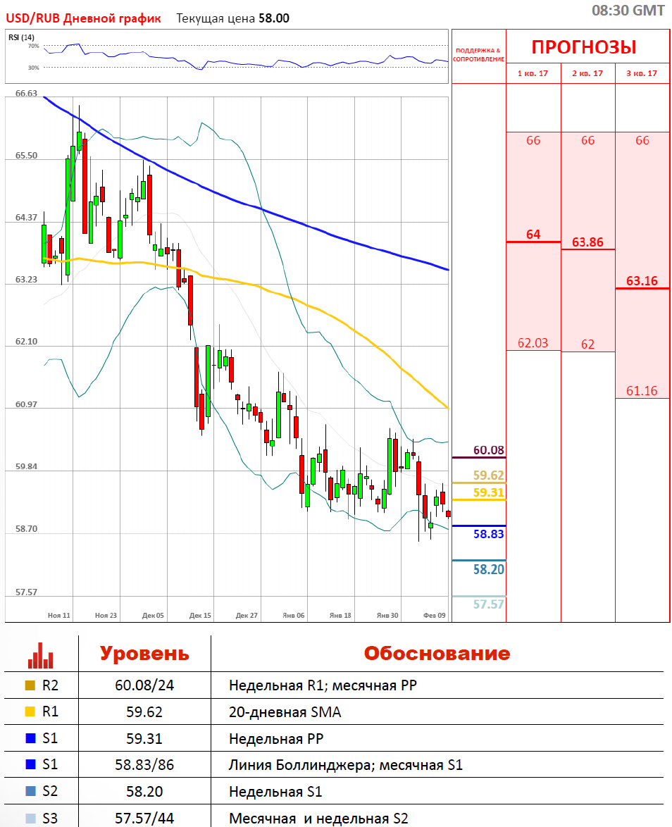 Вчера, 8 февраля, валютная пара USD/RUB торговалась разнонаправленно. Российская национальная валюта начала день с ослабления, но всё же смогла восстановить понесённые потери в течение дня. Поддержку рублю оказала стабилизация цен на нефть. Завершилась же сессия укреплением рубля против доллара США на 0.38%, тогда как волатильность торгов составила 0.91%. Сегодня c утра валютная пара EUR/USD торгуется в красной зоне на отметке 59.0370, где снизу её сдерживают месячная S1 и нижняя линия Боллинджера на уровнях 58.86/83.