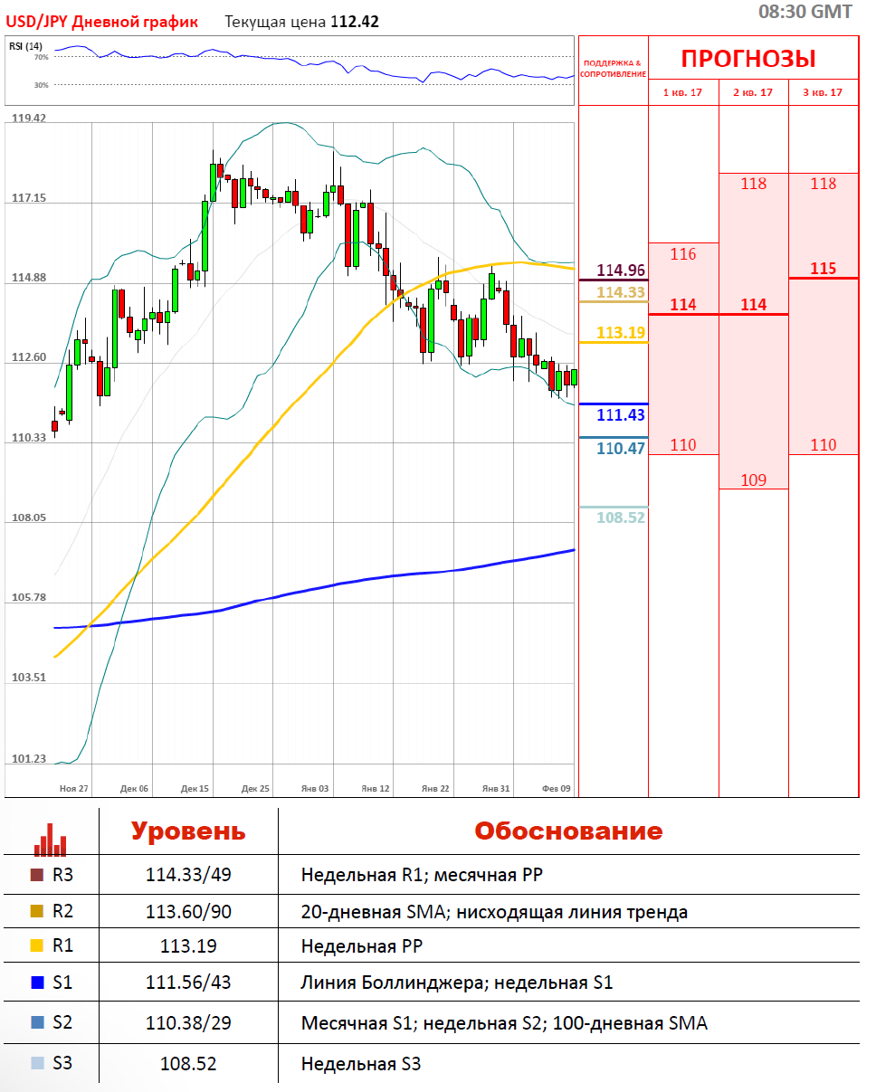 Вчера торги по валютной паре USD/JPY проходили в красной зоне и завершились укреплением японской иены против американского доллара на 45 пунктов, а волатильность торгов составила 92 пункта. С начала года японская иена отыграла почти половину потерь и пробила важные уровни сопротивления. С начала этой недели валютная пара USD/JPY торгуется преимущественно в боковом канале. Сейчас торги проходят в зелёной зоне около отметки 112.41, где снизу поддерживается недельной S1, которая расположилась на отметке 111.43.