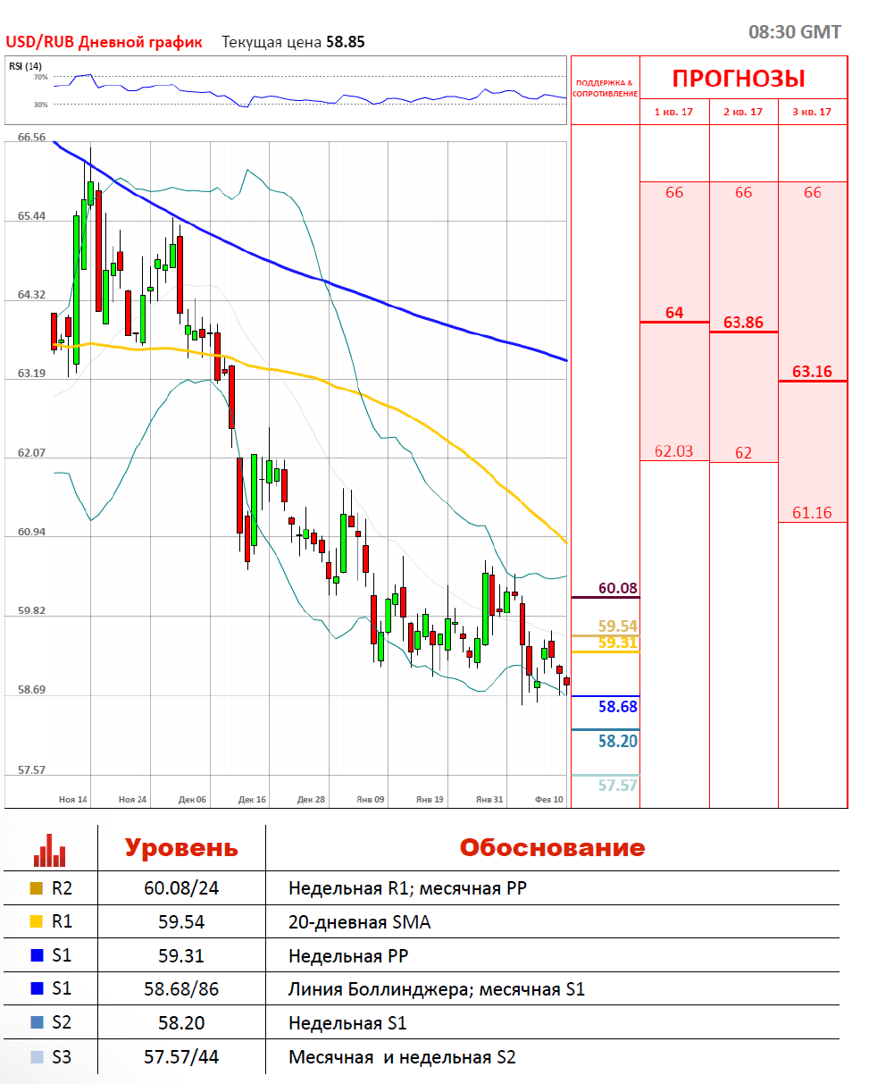 В четверг, 9 февраля, торги по валютной паре USD/RUB проходили в красной зоне и завершились укреплением рубля против доллара США на 0.19%, тогда как волатильность составила 0.76%. Дорожающая нефть, а также интерес зарубежных инвесторов к российским активам продолжают поддерживать национальную валюту. Сегодня с утра торговая сессия проходит в красной зоне на отметке 58.77. Валютная пара USD/RUB уже пересекла месячную S1 на уровне 58.86, а снизу её сдерживает нижняя линия Боллинджера на 58.83.