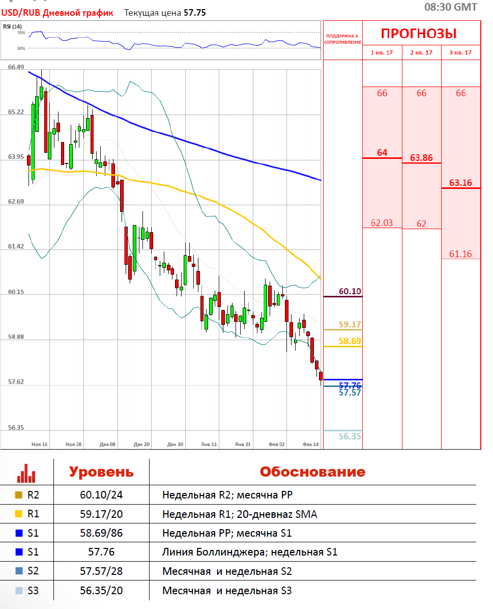 Эту неделю национальная валюта России начала с укрепления своих позиций относительно доллара США. Фактором роста рубля является спрос на него со стороны иностранных инвесторов. Вчера торги по валютной паре USD/RUB проходили в красной зоне и завершились укреплением рубля против доллара США на 0.44%. В начале торговой сессии пара USD/RUB усиленно тестирует нижнюю линию Боллинджера на 57.85, а также недельную S1 на уровне 57.76, где так же стремится достичь локальных уровней сопротивлений, а именно месячную S2 и недельную S2 на 57.57/28.