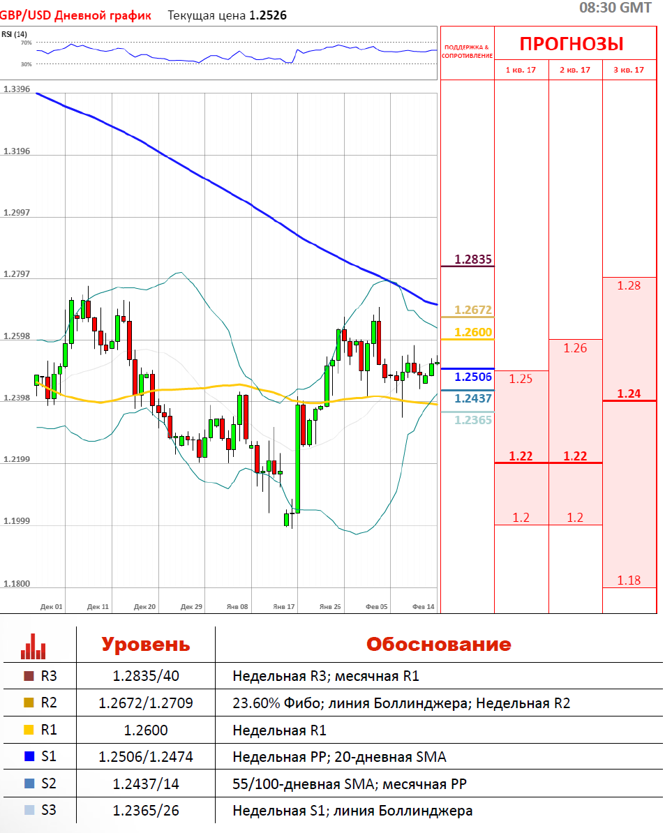 13 февраля, торговая сессия по валютной паре GBP/USD проходила в зелёной зоне и завершилась укреплением британского фунта против доллара США на 33 пункта, а волатильность торгов составила 57 пунктов. Уже в течение недели валютная пара GBP/USD продолжает движение преимущественно в боковом канале. Сейчас торги по паре GBP/USD ведутся в зелёной зоне около отметки 1.2530. Пока пара демонстрирует рост и стремится достичь недельной R1, которая расположилась на отметке 1.2600. Снизу пара поддерживается 20-дневной SMA на отметке 1.2474.