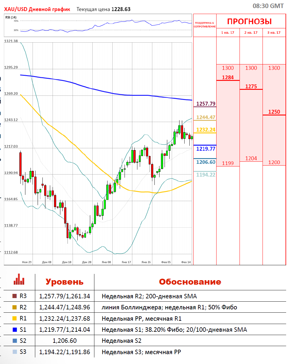 Сегодня, в ходе утренних торгов, стоимость золота растёт из-за удешевления американского доллара к мировым валютам. В начале этой недели торги по паре XAU/USD проходили в красной зоне и завершились укреплением доллара США против золота на 0.61%. Во вторник с утра торговая сессия началась в зелёной зоне около отметки 1,226 между локальными уровнями поддержки и сопротивления. Сегодня ожидаются важные выступления Йеллен, где ужесточение монетарной политики США может способствовать удорожанию доллара и снижению стоимости золота.