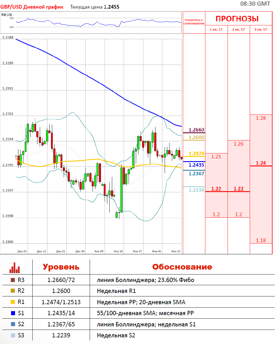 14 февраля британский фунт снизился по отношению к доллару на фоне публикации отчёта по инфляции Великобритании. Вчера торговая сессия по валютной паре GBP/USD проходила в красной зоне и завершилась укреплением американского доллара против британского фунта на 57 пунктов, а волатильность торгов составила 106 пунктов. Валютная пара GBP/USD продолжает вчерашнее нисходящее движение, и сейчас торги по паре GBP/USD ведутся в красной зоне около отметки 1.2430, где она усиленно тестирует 55/100-дневные SMA и месячная РР на отметках 1.2435/28/14.