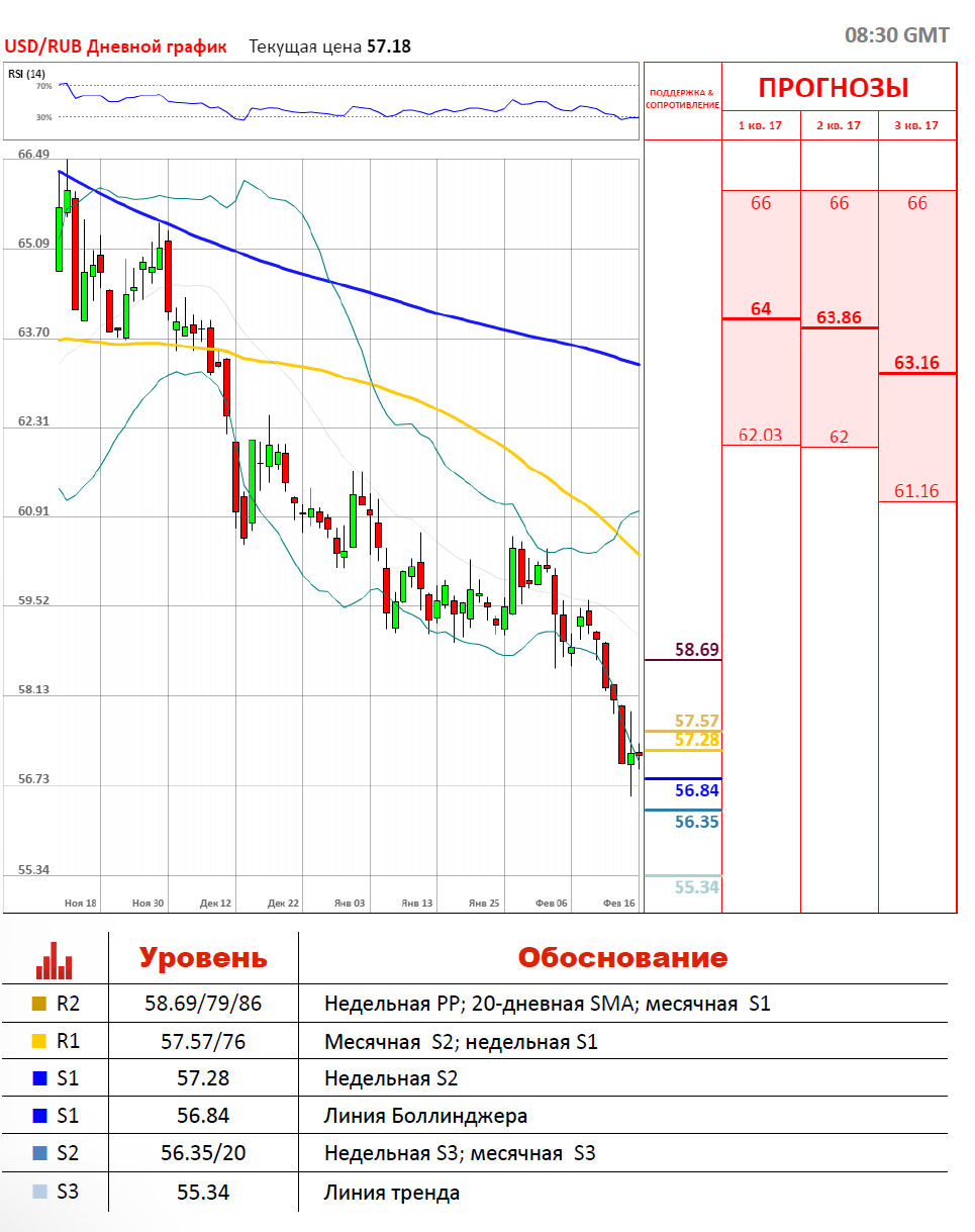 Вчера, после пятидневного безостановочного роста, рубль резко снизился на фоне повышения доходности ОФЗ и американских облигаций. Доллар США укрепился против национальной валюты на 0.33 пункта, в то время как волатильность торгов составила 2.34 пунктов. Однако, это был краткосрочный рост, и, сегодня, рубль вновь начал своё укрепление. С утра торговая сессия проходит около отметки 57.25, где уже протестировала локальный уровень поддержки, а именно недельную S2 на 57.28 и стремится к уровню сопротивления, а именно к нижней линии Боллинджера на 56.82.