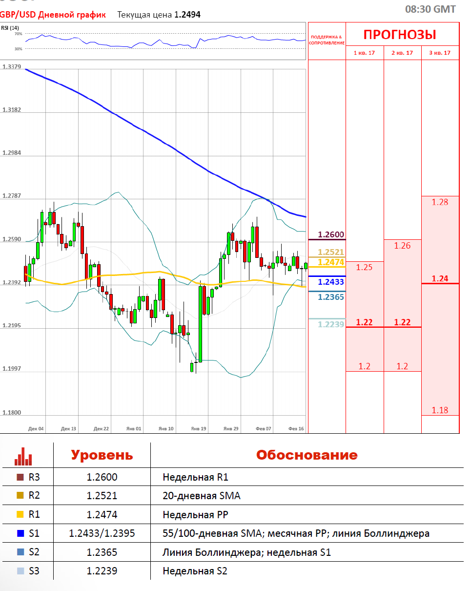 15 февраля британский фунт снизился по отношению к доллару США до минимума сессии на фоне публикации отчёта по занятости и зарплатам Великобритании. Вчера торговая сессия по валютной паре GBP/USD проходила в красной зоне, преимущественно ниже недельной точки разворота на 1.2474, также пара тестировала и сильное скопление сопротивлений в районе 1.2434-1,2414, однако закрепиться ниже данных уровней так и не смогла. Сегодня же, торговая сессия по паре GBP/USD началась в зелёной зоне и ведётся преимущественно в боковом канале около отметки 1.2474, усиленно тестируя недельную РР.
