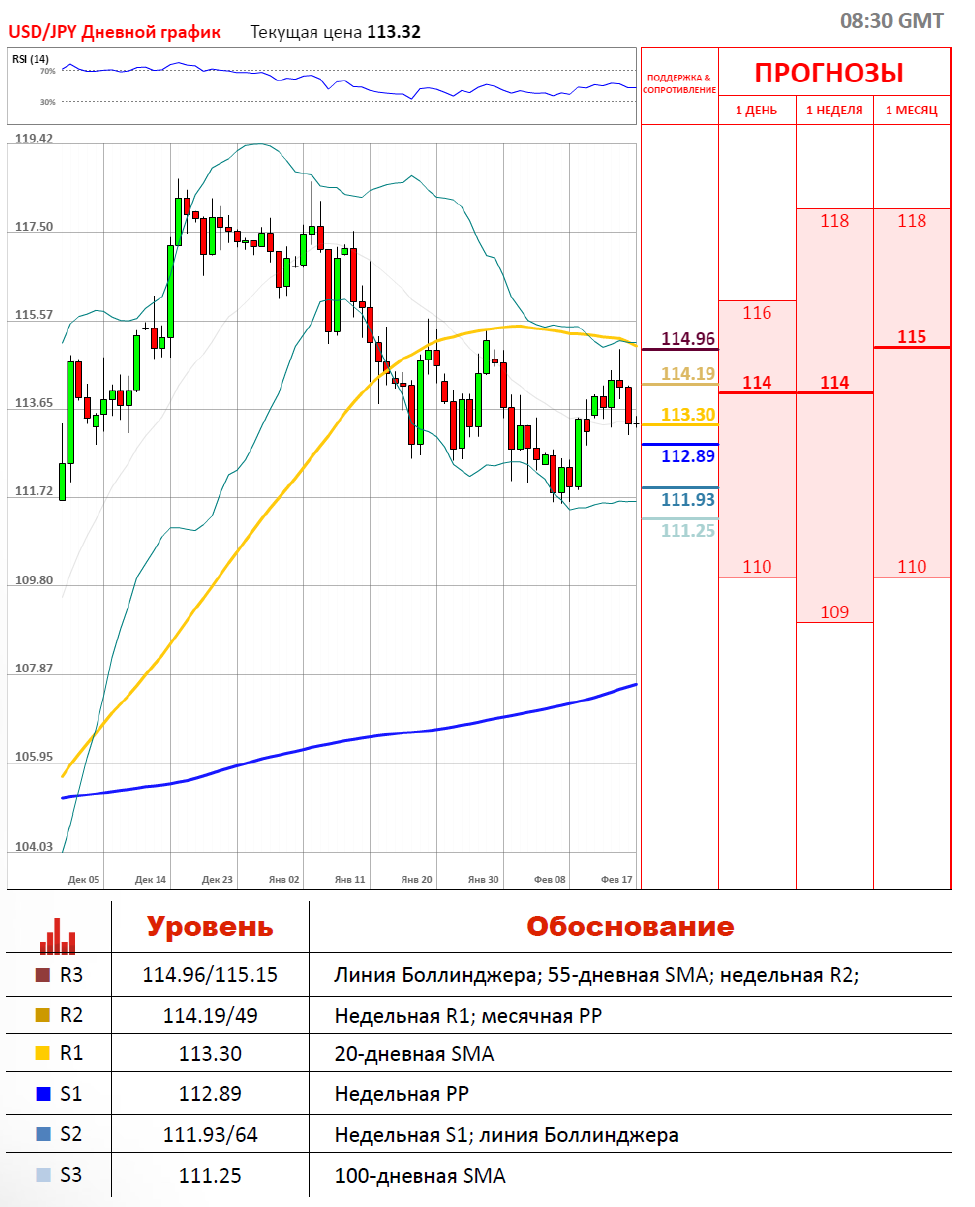 Вчера валютная пара USD/JPY продолжила своё нисходящее движение. Японская иена укрепилась по отношению к американскому доллару на 92 пунктов, в то время как волатильность торгов составила 124 пунктов. Пара USD/JPY преодолела недельную R1 на 114.19, а завершила торговую сессию ниже 20-дневной SMA на 113.36. Сегодня торги по паре начались в зелёной зоне, где с утра проходили около отметки 113.45. Тем не менее, сейчас пара снижается, где усиленно тестирует недельную РР на отметке 112.89.