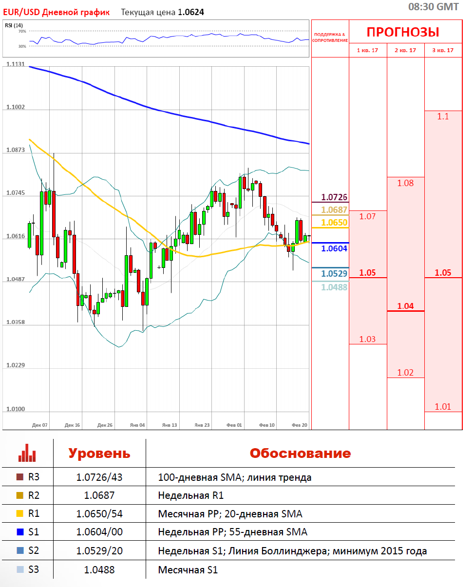 В пятницу, 17 февраля, торговая сессия завершилась в красной зоне, где американский доллар укрепился по отношению к европейской валюте на 62 пункта. Таким образом, доллар отыграл потери четверга. Валютная пара EUR/USD пересекла 20-дневную SMA на 1.0657 и месячную РР на 1.0650, однако, 55-дневную SMA, расположившуюся на 1.0602, достичь не смогла. Сегодня же, торги по паре начались в зелёной зоне, где пара торгуется выше недельной РР на 1.0604. Вероятно, что сегодня евро отыграет пятничные потери в связи с тем, что в США выходной.