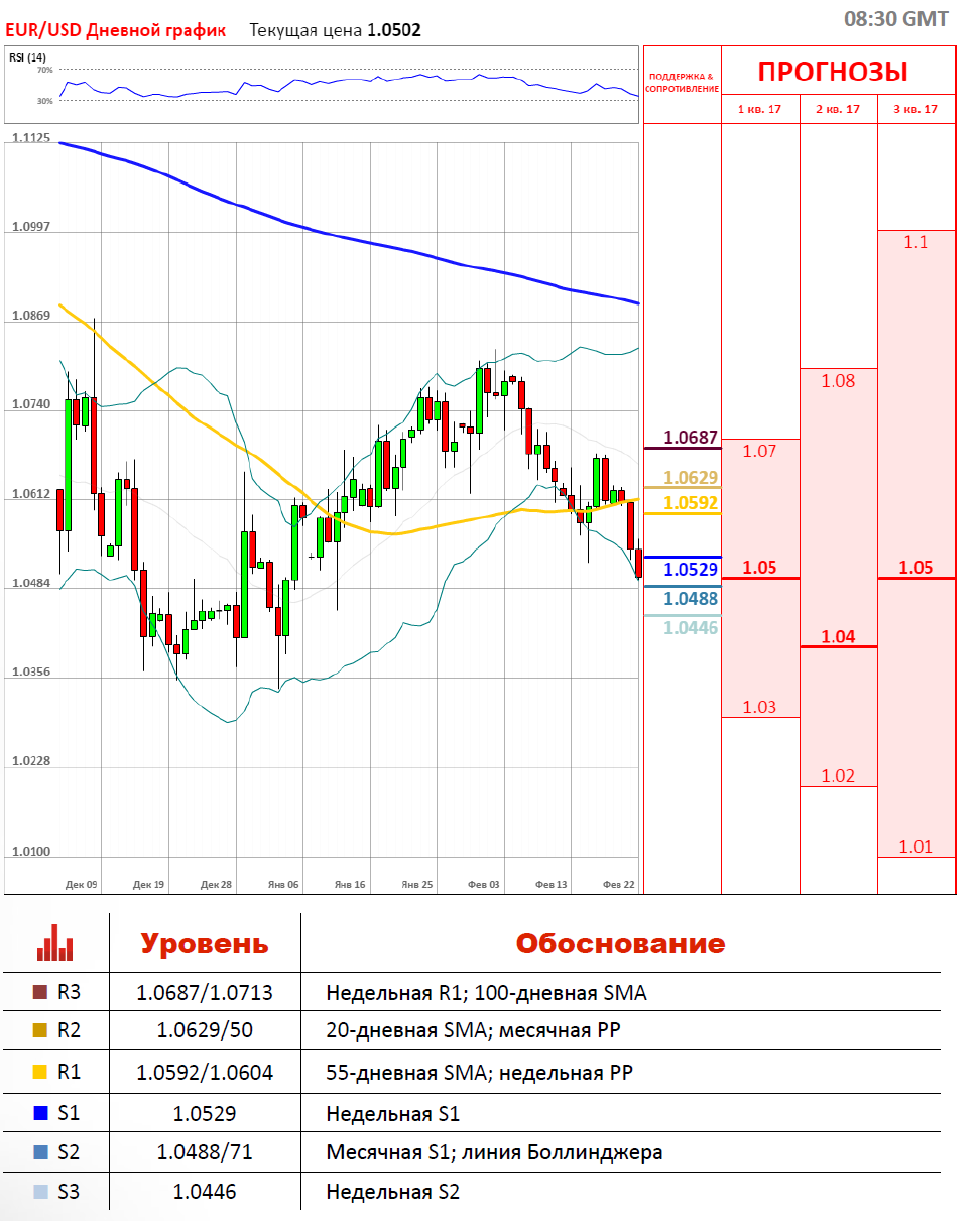 Во вторник, 21 февраля, торги по паре EUR/USD завершились ростом доллара США по отношению к европейской валюте на 76 пунктов, а волатильность составила 90 пунктов. Во время вчерашних торгов пара пересекла недельную РР на отметке 1.0604 и 55-дневную SMA на 1.0596. Сегодня американский доллар продолжает укрепляться, и сейчас торги проходят около недельной S1 на 1.0528, после пересечения которой, пара стремится к месячной S1 на 1.0487. Негативное влияние на евро оказывает политическая неопределенность в Европе.