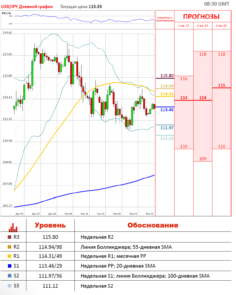 Торговая сессия по валютной паре USD/JPY во вторник завершилась в пользу американского доллара на 55 пунктов. Пара закрепилась выше недельной точки разворота, которая находится на отметке 113.46 и 20-дневной SMA на 113.29. В среду с утра валютная пара USD/JPY демонстрирует снижение на основе информации центробанка Японии о смягчении денежно-кредитной политики. Сейчас пара торгуется около отметки 113.34, где уже пересекла недельную РР и стремится пересечь локальный уровень сопротивления, а именно 20-дневную SMA.