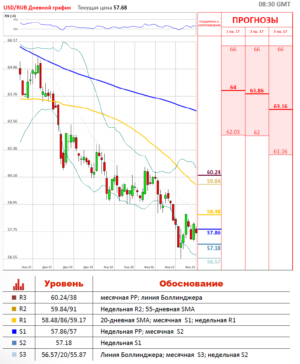 Вчера доллар продемонстрировал значительное укрепление по отношению к российский валюте на 1.17%, а волатильность торгов составила 1.48%. Валютная пара закрепилась выше локальных уровней сопротивления, а именно месячной S2 на 57.57 и недельной РР на 57.86. Тем не менее, на национальную валюту положительно влияют благоприятная внешняя обстановка, действия Минфина и Центробанка, а также мировые цены на нефть. Несмотря на краткосрочный рост доллара, рубль все имеет преимущества. Сегодня торги не определились с динамикой, где они проходят около отметки 57.73.