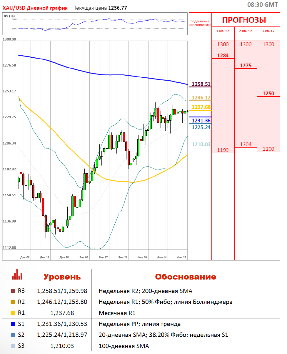 На протяжении недели пара XAU/USD торгуется в боковом канале. В среду торговая сессия закрылась победой золота над долларом США на 0.15%, в то время как волатильность составила 0.74%. Пара XAU/USD тестировала локальный уровень сопротивления, а именно недельную R1 на 1,237, однако закрепиться выше неё так и не смогла. Сегодня с утра пара ещё не определилась с направлением своего движения и торгуется около отметки 1,236 между локальными уровнями сопротивления и поддержки, а именно недельной точки разворота на 1,231 и месяной R1.