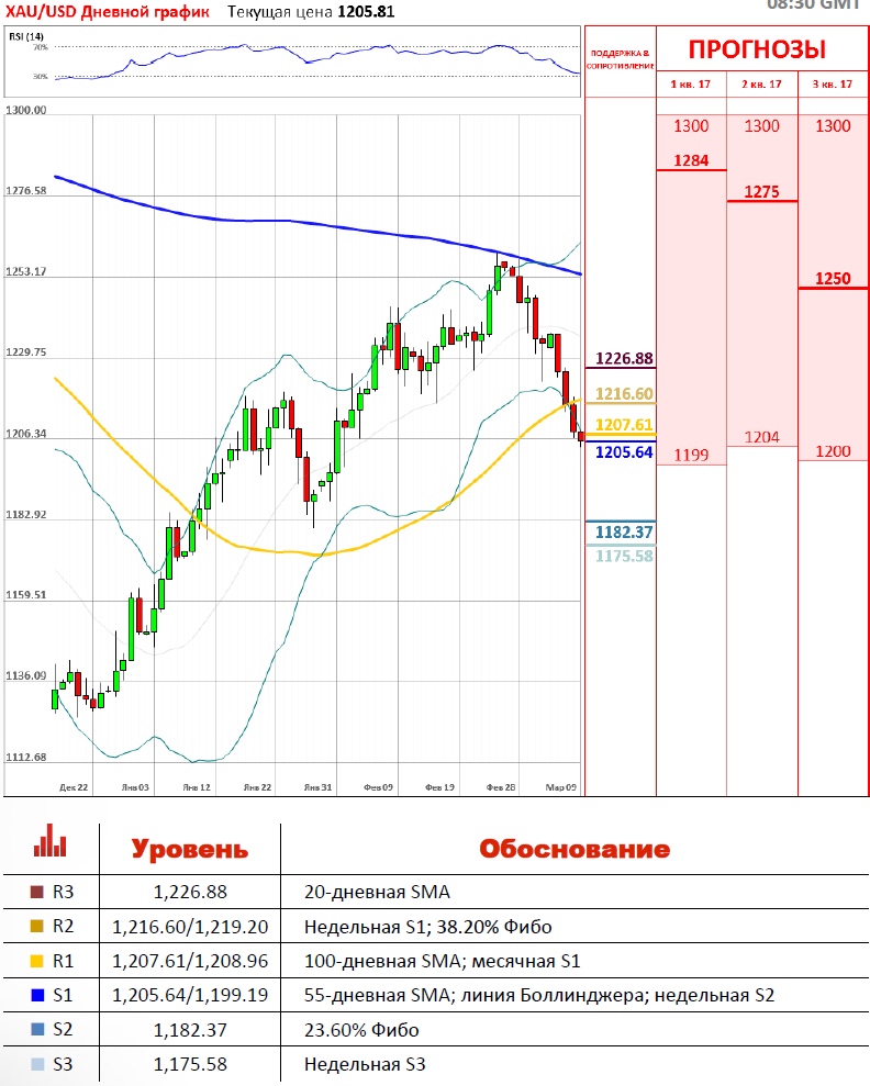Вчера торги по паре XAU/USD завершились в красной зоне около отметки 1,206. Золото упало на 0.63% по отношению к американскому доллару, а волатильность торгов составила 0.99%. Уже четвёртую торговую сессию подряд наблюдаем нисходящее движение по паре XAU/USD. 9 марта с утра пара тестировала месячную S1 и 100-дневную SMA на 1,208/7. Сейчас торговая сессия вновь проходит в красной зоне около отметки 1,206, где XAU/USD стремиться к локальным уровням сопротивления, а именно 55-дневной SMA и недельной S2 на 1,205/1,199.