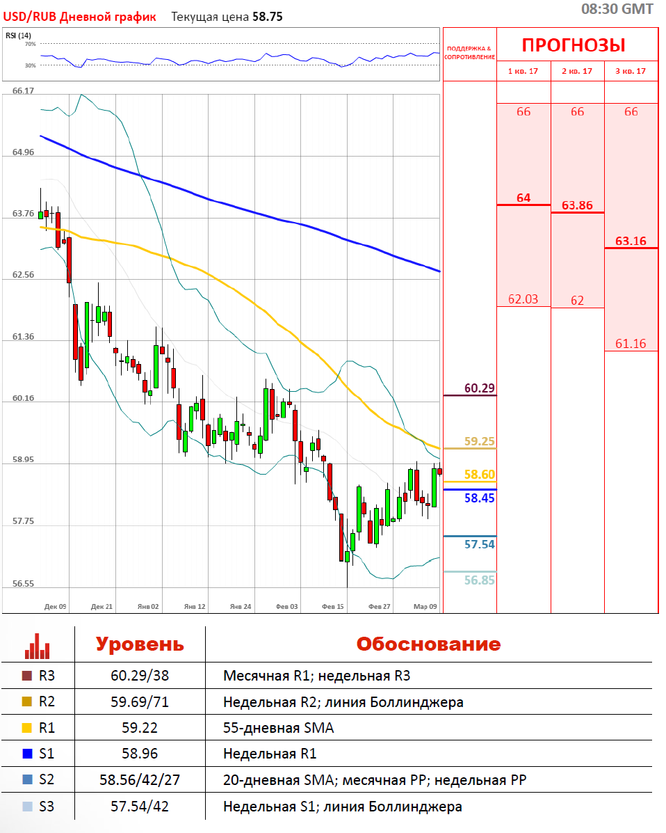 В ходе торгов, 9 марта, американский доллар укрепился по отношению к рублю на 0.78%, а волатильность составила 1.34%. Стабилизация цен на нефть в пятницу утром позволила паре USD/RUB открыться около уровней предыдущего закрытия. На момент публикации данного материала, российская валюта демонстрирует незначительный рост, торгуясь около отметки 59.10. Торги по паре USD/RUB проходят между локальными уровнями поддержки и сопротивления, а именно 55-дневной SMA на 59.22 и недельной R1 на 58.96. Сегодняшний отчёт по занятости в США повлияет на цены на нефть и на валютную пару USD/RUB.