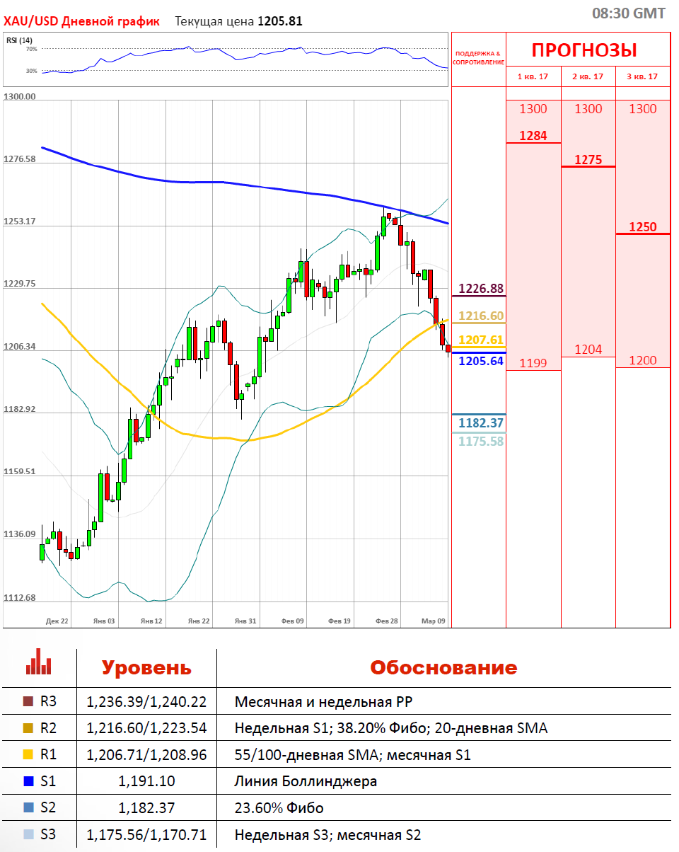 Пара XAU/USD уже пятую торговую сессию подряд проводит в красной зоне. Вчера золото подешевело по отношению к американскому доллару на 0.58%, а волатильность торгов составила 0.83%. 10 марта пара продолжает снижаться, где с утра пересекла недельную S2 на 1,199. Сейчас XAU/USD торгуется около отметки 1,196 и стремится к локальному уровню сопротивления, а именно нижней линии Боллинджера на 1,191. Из-за ожидаемого повышения процентной ставки США и укрепления доллара, золото в пятницу опустилось до шестинедельного минимума.