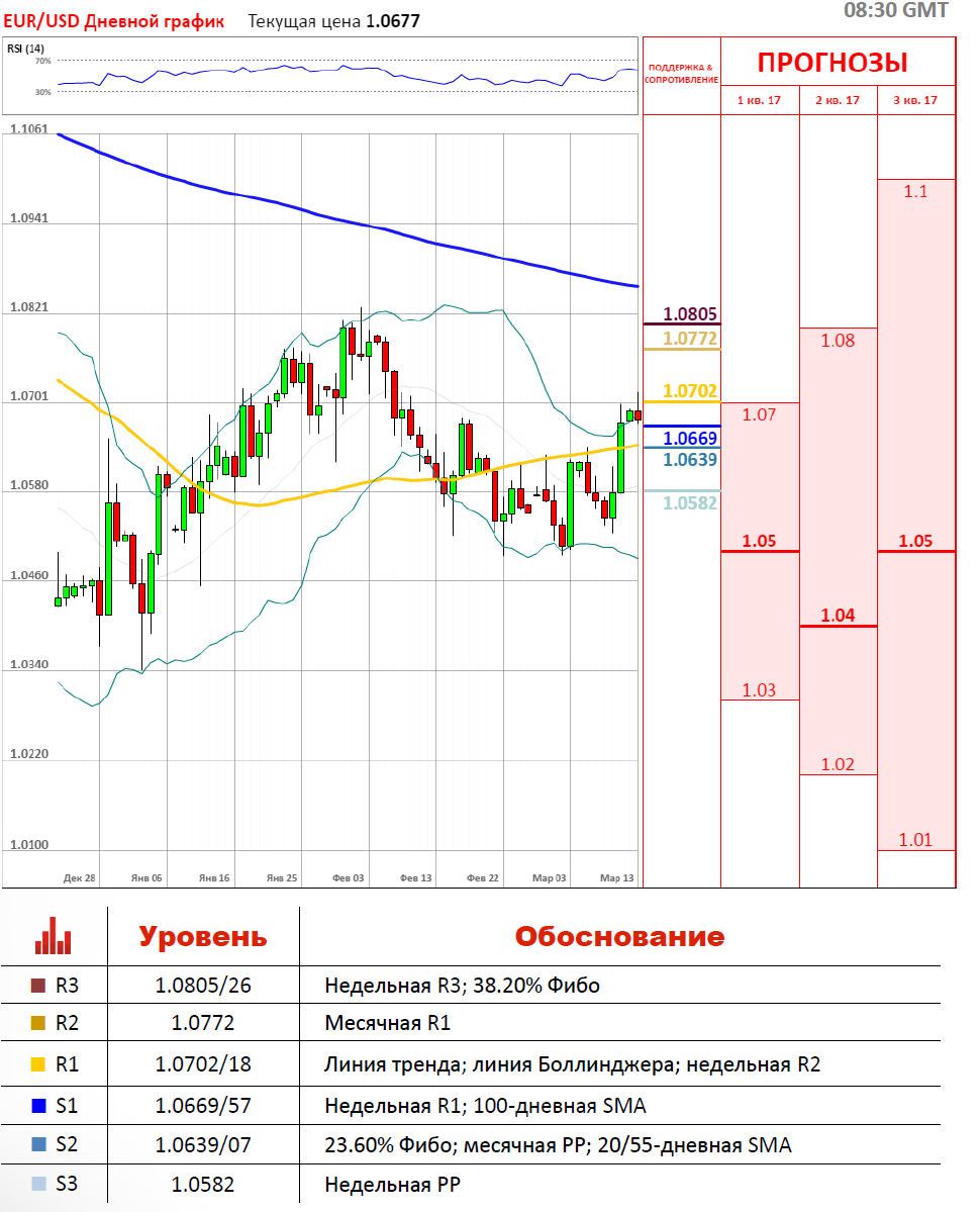 В пятницу торги по паре EUR/USD завершились укреплением евро по отношению к доллару США на 97 пунктов, а волатильность составила 127 пунктов. Сегодня торги по паре открылись в красной зоне, где на данный момент проходят у отметки 1.0668. С утра пара EUR/USD пересекла верхнюю линию Боллинджера на 1.0692 и сейчас стремится к уровню сопротивления—100-дневной SMA на 1.0656. Дальнейшее движение пары EUR/USD зависит от спроса на доллар, т.к. выпуск важных экономических отчётов на этой неделе в еврозоне не ожидается.
