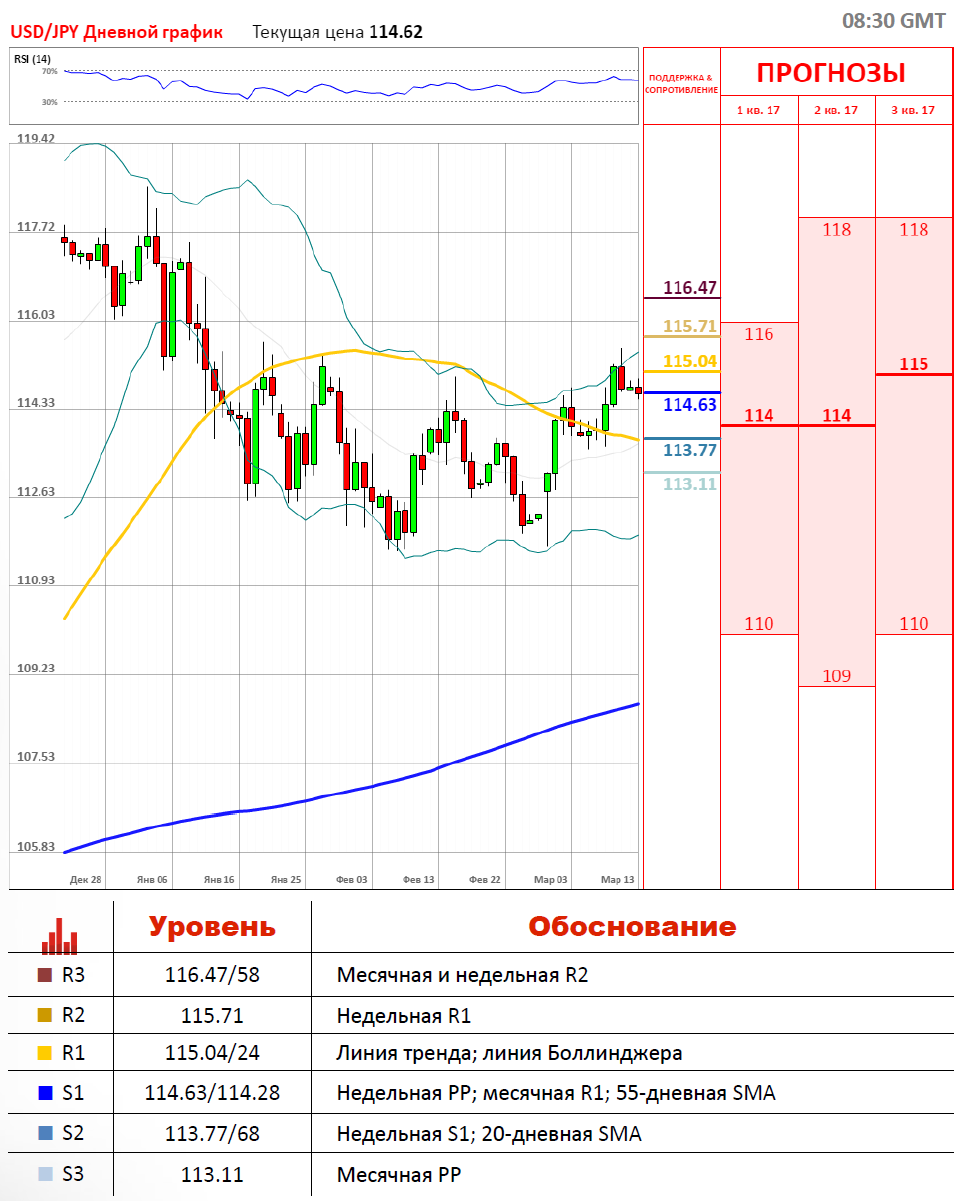 Последняя торговая сессия на прошлой неделе по паре USD/JPY завершилась ростом японской иены против доллара США на 10 пунктов, в то время как волатильность торгов составила 86 пунктов. Сегодня с утра валютная пара USD/JPY продолжает нисходящее движение, где сейчас торги проходят у отметки 114.67. Валютная пара USD/JPY с утра усиленно тестирует месячную R1 на 114.65, закрепившись ниже которой, пара будет стремится к преодолению следующего локального уровня сопротивления, а именно 55-дневной SMA на 114.28. Нисходящее движение пары похоже на коррекцию после импульсивного роста на предыдущей неделе.