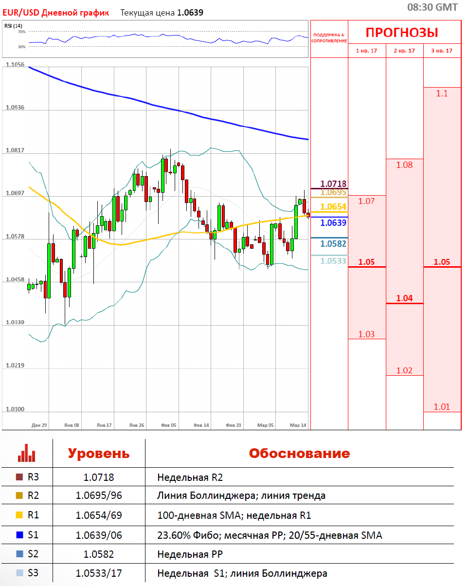 Вчера торги по паре EUR/USD закрылись снижением европейской валюты по отношению к доллару США на 22 пункта, а волатильность составила 63 пункта. Сегодня пара торгуется вновь в красной зоне около отметки 1.0638. С утра пара EUR/USD пересекла 100-дневную SMA на 1.0654 и сейчас стремится к локальному уровню сопротивления, а именно месячной РР на 1.0632. Сегодня начнётся заседание FOMC, а завтра ЦБ США огласит решение по процентным ставкам, что будет иметь существенное влияние на дальнейшее движение пары EUR/USD.