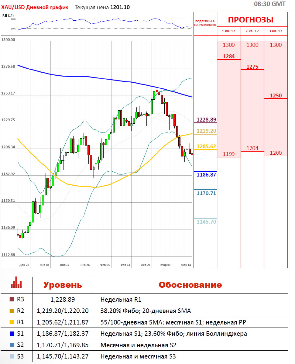 Вчера, несмотря на утреннее восходящее движение пары XAU/USD, торговая сессия завершилась в красной зоне у отметки 1,202, где доллар США укрепился против золота на 0.28%. Сегодня же, во время утренних торгов пара растёт и сейчас торгуется в боковом канале около отметки 1,203. Пара XAU/USD с утра находится между локальными уровнями поддержки и сопротивления, а именно недельной S2 и 55-дневной SMA на 1,199/205. Из-за пониженного интереса к инвестициям в драгметалл, а также укрепления фондового рынка США, не ждём большого роста цен на золото.