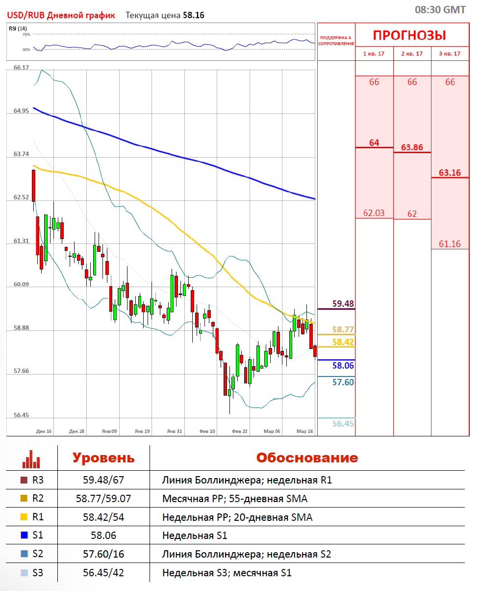 В ходе торгов среды российский рубль укрепился по отношению к доллару США на 1.19%, а волатильность составила 1.45%. Сегодня торги по валютной паре USD/RUB проходят вновь в красной зоне около отметки 58.05. С утра пара пересекла локальные уровни сопротивления, а именно месячную РР на 58.42 и недельную S1 на 58.06, в свою очередь уровнем поддержки для пары является 20-дневная SMA на 58.54. Ожидаем укрепление российской валюты сегодня на фоне ослабления доллара к мировым валютам и восстанавливающихся цен на нефть.