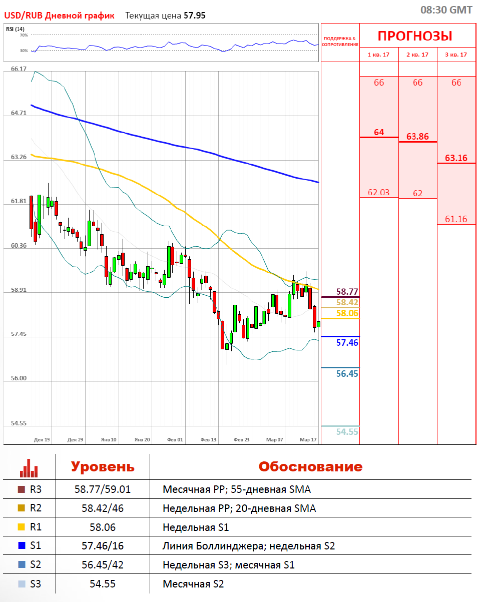 «Вчера рубль продолжил краткосрочное движение в сторону укрепления на внешнем позитиве и комментариях президента РФ Путина о том, что преждевременное снижение ключевой ставки могло бы ослабить российскую валюту. На дневных минимумах курс пары доллар/рубль опускался к уровню 57,62»