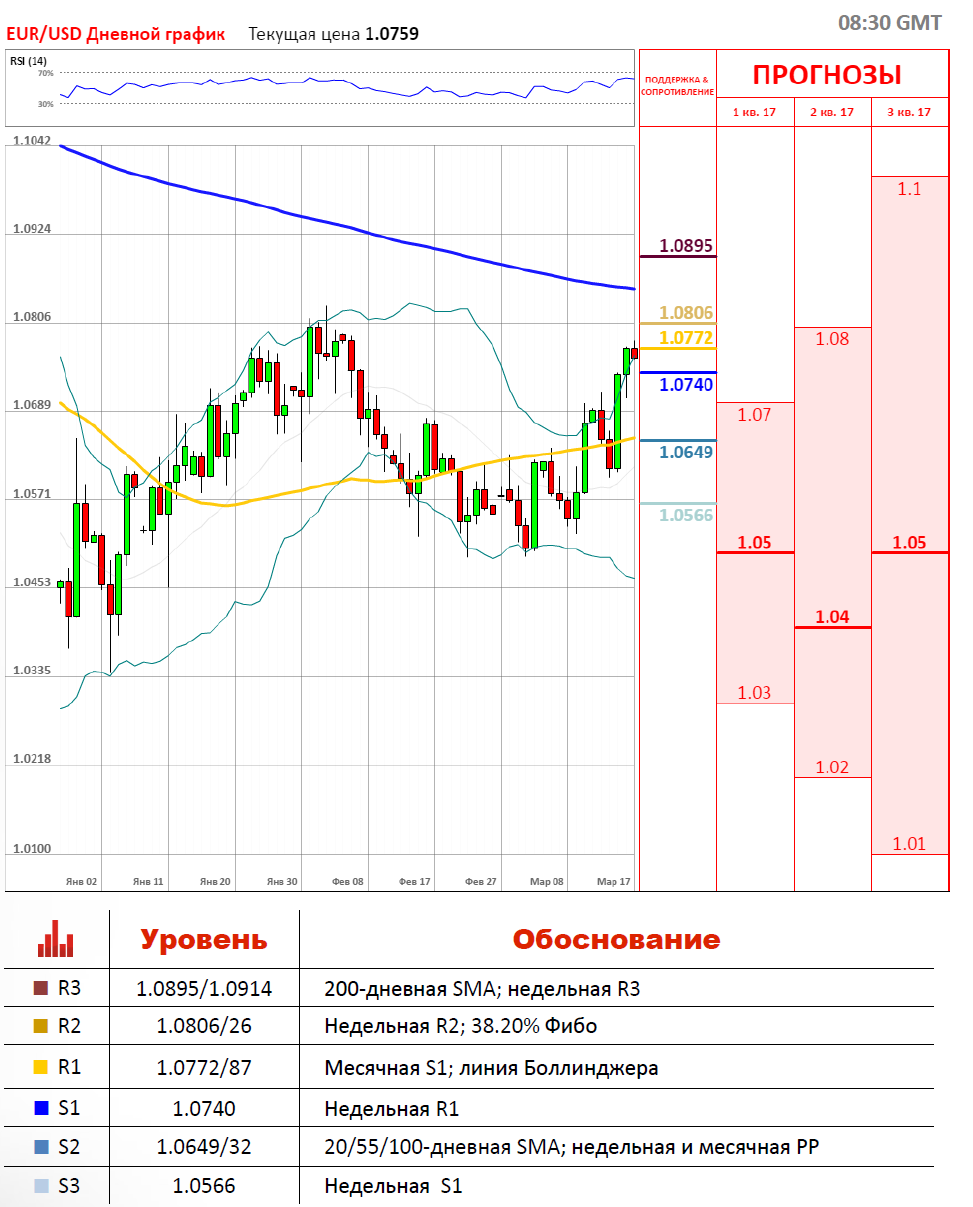 16 марта торги по паре EUR/USD завершились ростом европейской валюты к доллару США на 32 пункта. В пятницу с утра валютная пара вновь торгуется в зелёной зоне около отметки 1.0771, усиленно тестируя область месячной R1 на 1.0772. Локальными уровнями поддержки и сопротивления для EUR/USD на данный момент являются недельная R1 на 1.0739 и верхняя линия Боллинджера на 1.0789. На дальнейшее движение валютной пары EUR/USD будет влиять запланированная на сегодня публикация отчёта о промышленном производстве США.