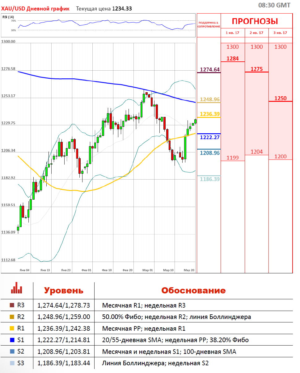 На прошлой неделе торги по паре XAU/USD были отмечены укреплением золота против доллара США. Так, в пятницу, драгметалл вырос по отношению к американской валюте на 0.27%, а волатильность торгов составила 0.59%. Первую торговую сессию на этой неделе пара начала вновь в зелёной зоне, где с утра торги проходят около отметки 1,233. XAU/USD стремится к месячной точке разворота на 1,236, после пробоя которой, пара будет нацелена на следующий локальный уровень сопротивления, а именно недельную R1 на 1,242.